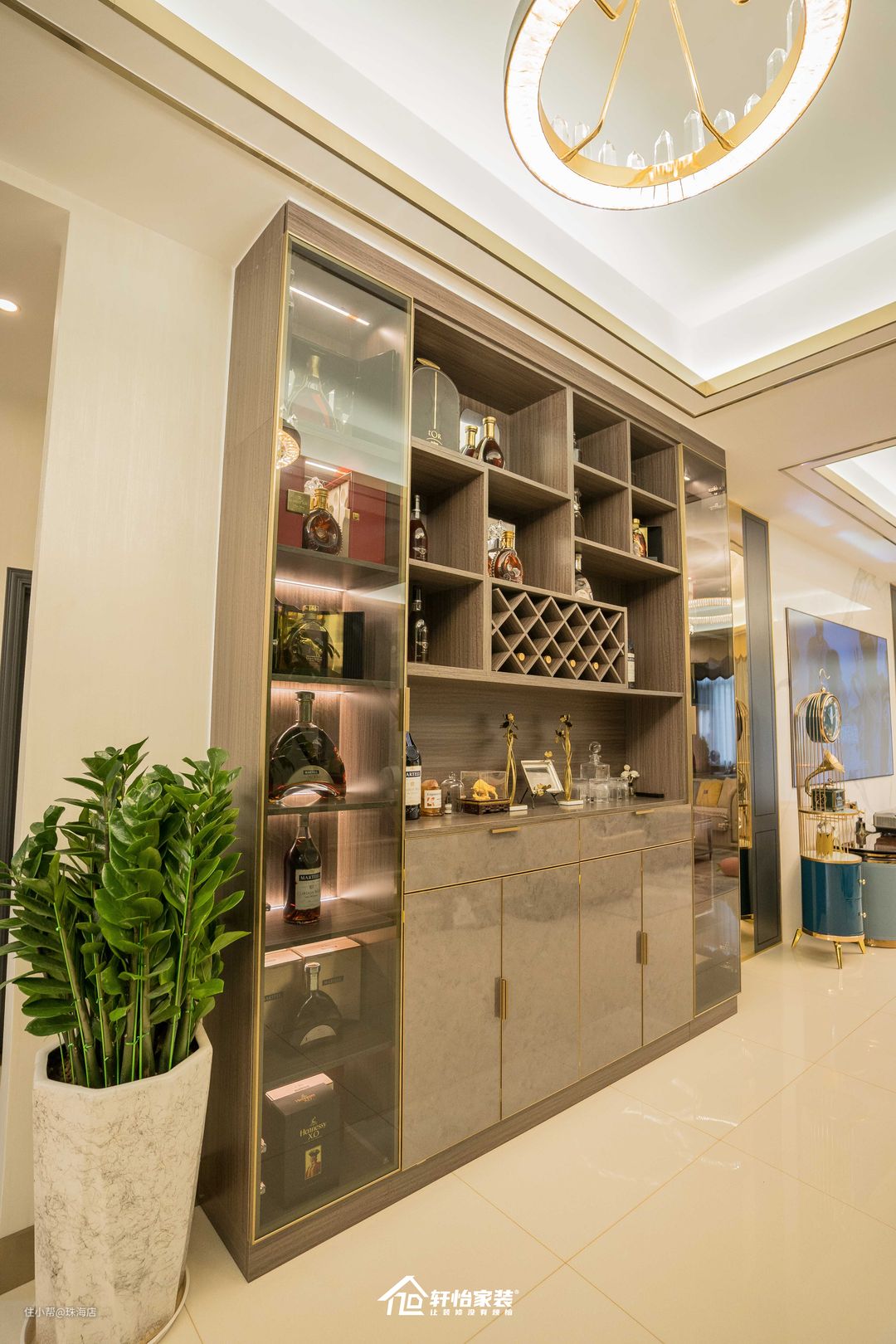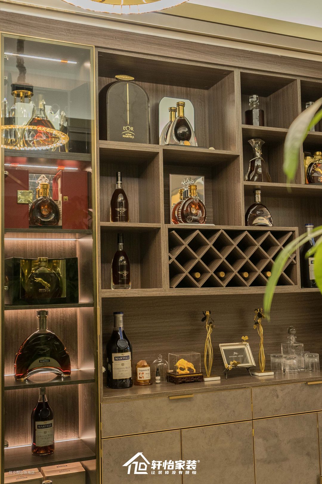 收纳酒柜玻璃柜门区域放一些珍贵名酒,高处开放区域放一些常喝的名酒,开放区域还贴心设计了放红酒和葡萄酒的菱形红酒架,柜子下方还设有储物柜,这储物空间真是杠杠的!