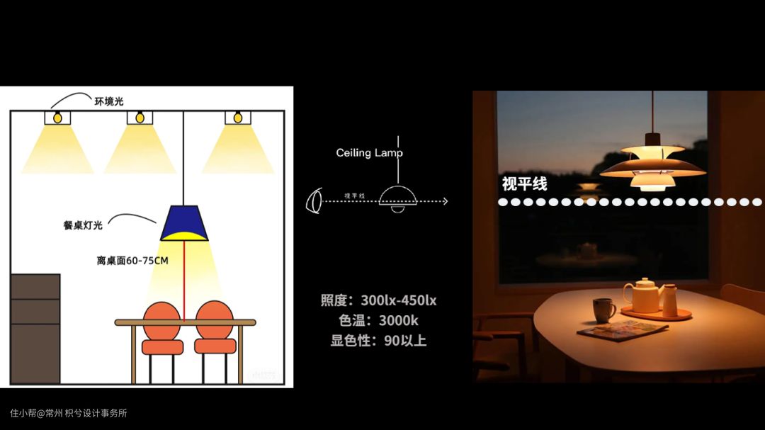 餐厅环境是聚焦的,聚焦点就是饭桌上的饭菜,其他地方的照明在就餐时没那么重要,同时就餐还有一个习惯是交谈,柔和和聚焦的灯光能让交谈的氛围更加融洽。