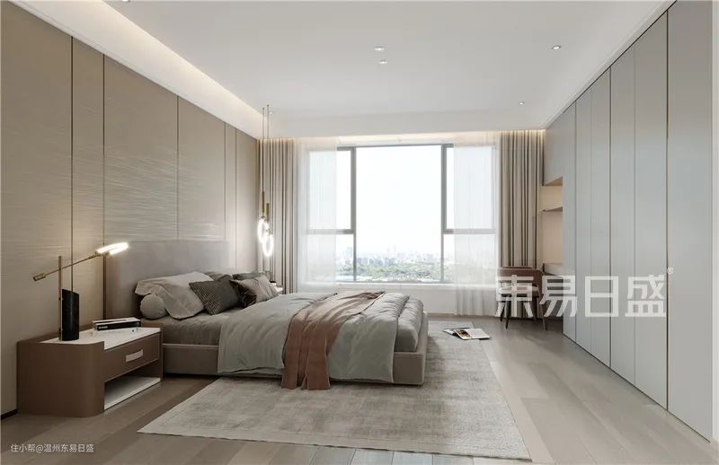 主卧的空间整体十分大气,统一的色调让空间明净简洁。电视墙将主卧室与衣帽间区域划分开来,保证室内的私密性。与楼下氛围略有不同,卧室设计更侧重于舒适。皮质的家具+高级灰色彩搭配,透过飘窗洒进来的光线,让空间洋溢着柔和宁静的气氛。