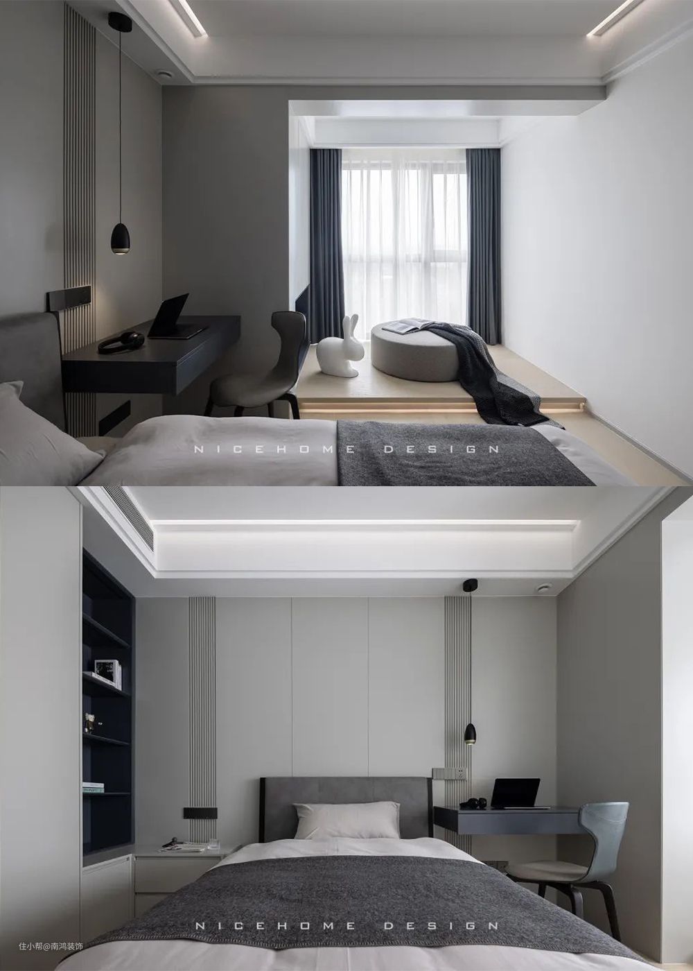灰色系设计简约又不失时尚,住到18岁也不会觉得过时。地台设计让小朋友可以尽情游戏玩耍,大大的窗户采光也是顶级的,学习休息两不误。