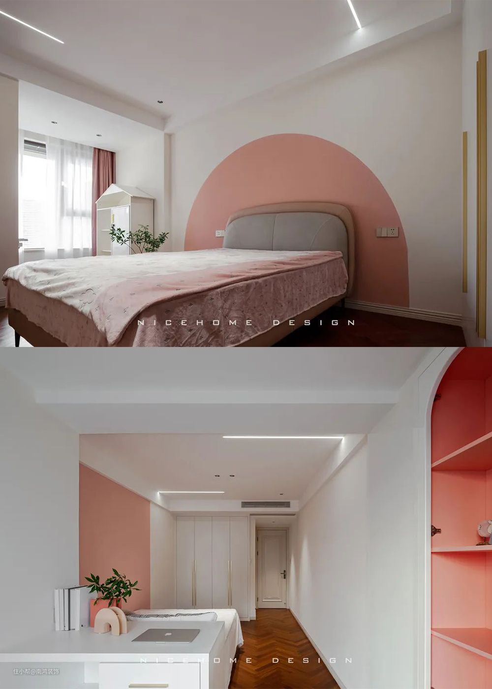 女孩子就是要pink~白色+清新粉的温柔配色,打造一个甜甜的梦。弧线造型背景墙,仿佛一轮初升太阳,带来满满元气,成年人看了都要羡慕!