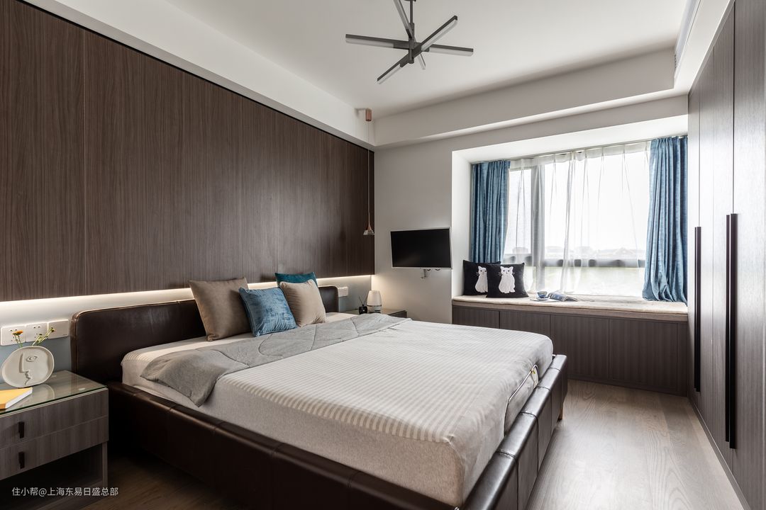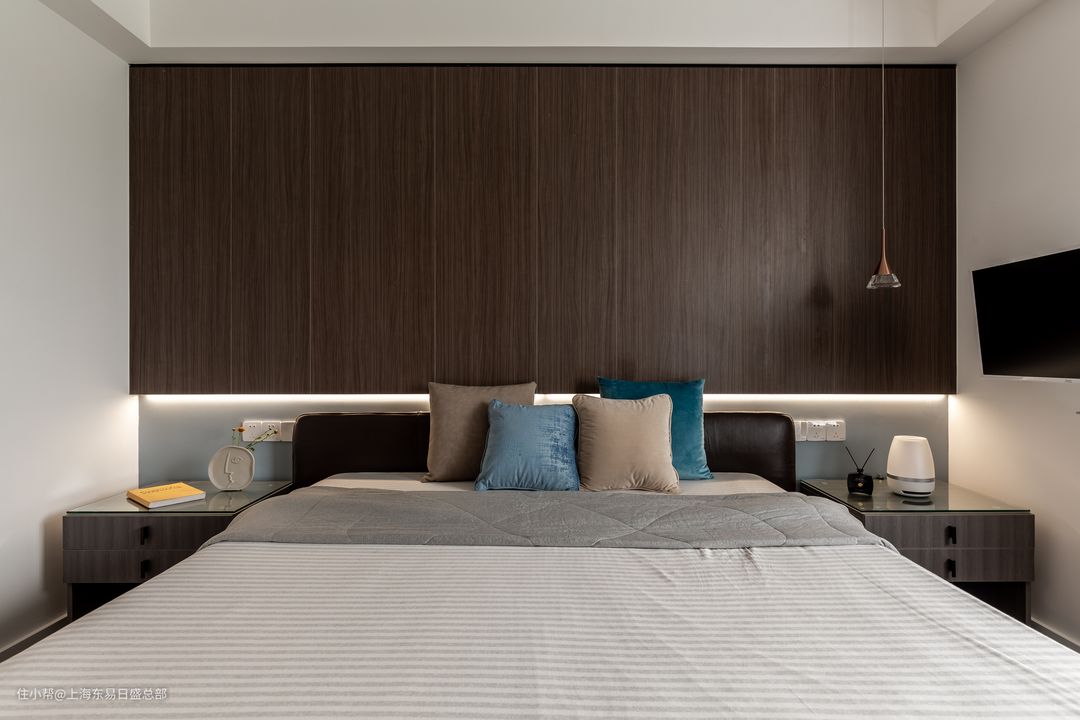床头背景墙除了作为装饰性空间存在,也可以充分结合墙面做成储物空间使用,做成悬挂式柜体,既保证了空间储物收纳的需求,也可以营造丰富的空间层次感。