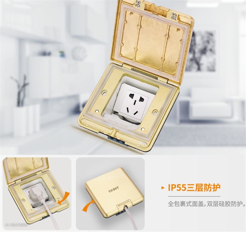 升级防水设计,防水等级达IP55,正泰开启式防水地插三重防护设计,防水防尘更安全耐用。全包裹式面板,内置双层硅胶密封圈,有效防水保护插座电线。使用时盖板可闭合,只留出线口,使用时也能防水防尘,保护使用安全。