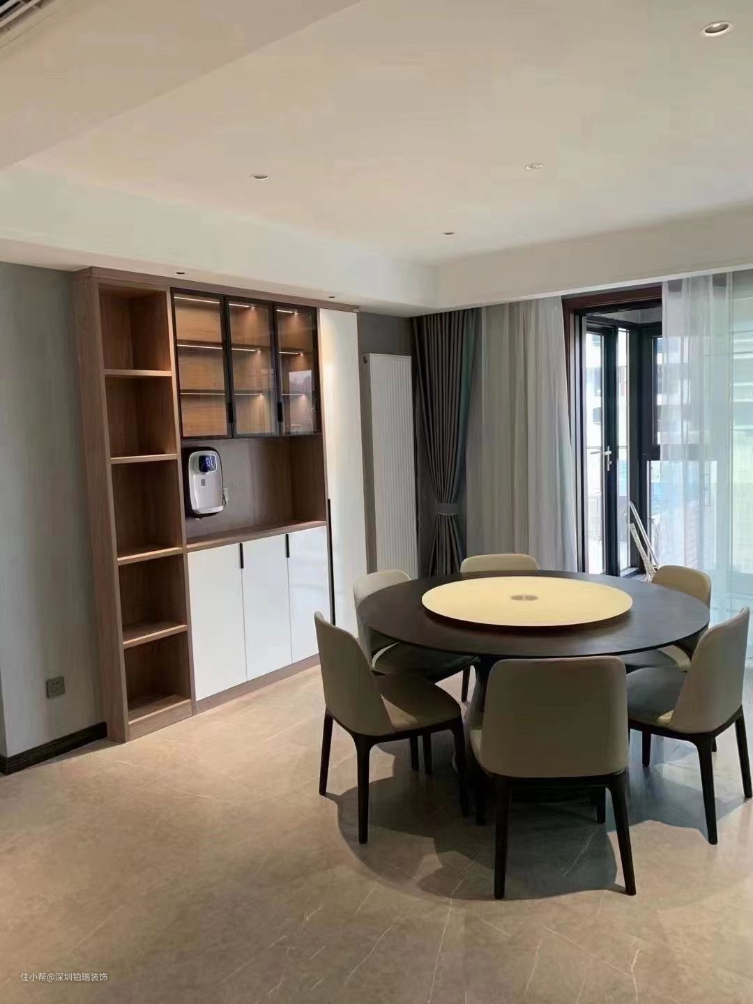餐厅与客厅保持相近配色,整体搭配很和谐。这个角度可以看到空间里的原木餐边柜,果然让屋子多了不少自然活力,选择圆形的深棕橡木餐桌满满的质感。