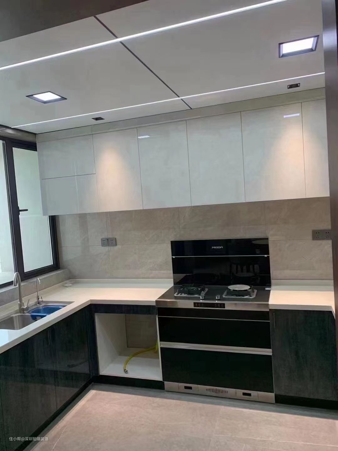 厨房空间算非常宽敞,所以选择了U型布局,分区清晰,做起饭菜来也方便许多。黑白的色调在厨房自然分开吊柜和地柜,非常有层次,吊顶上也是设计了条格灯带更具空间立体感。