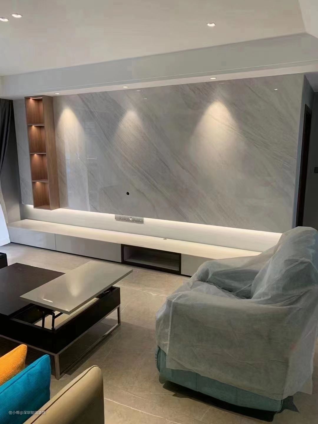 运用浅纹石材、光影设计、家居等元素将客厅氛围活跃起来,让整个空间有了温度。