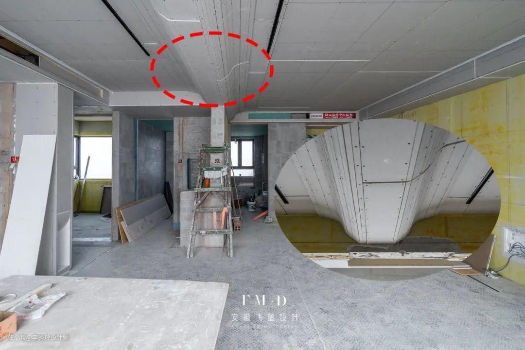 对于横梁突出的天花板来说,可以只在横梁位置增加弧度设计,可弱化横梁的生硬感: