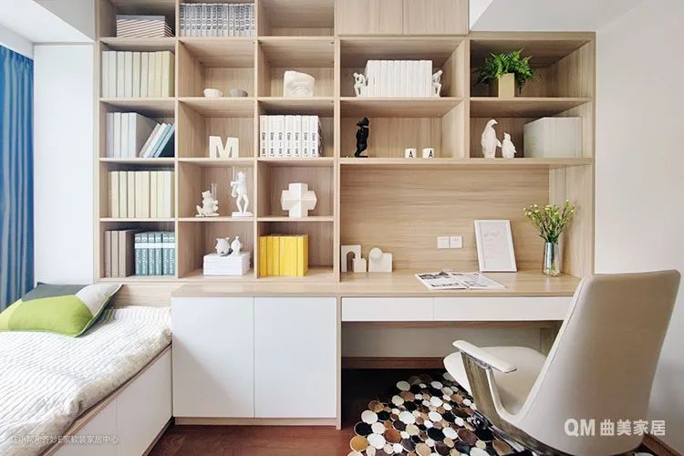 书房是男主人的最爱,每天在这里阅读、思考是他最充实的时光。宽大的窗户下方依旧采用飘窗设计,铺上软垫就成为一个榻榻米,躺在上面小憩或眺望景致都不错。最惬意的是在阳光充足的午后,坐在榻榻米上一边喝茶一边读书,简直不要太幸福~