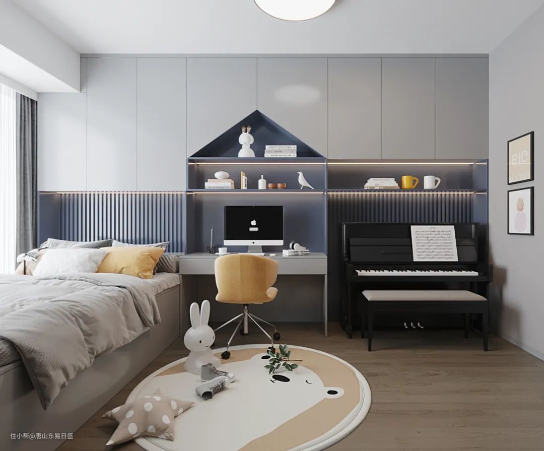 采用轻装修重装饰的设计,通过柜子不规则的造型增强整个空间的设计感,利用飘窗的空间跟榻榻米一起设计,合理利用了房间空间。