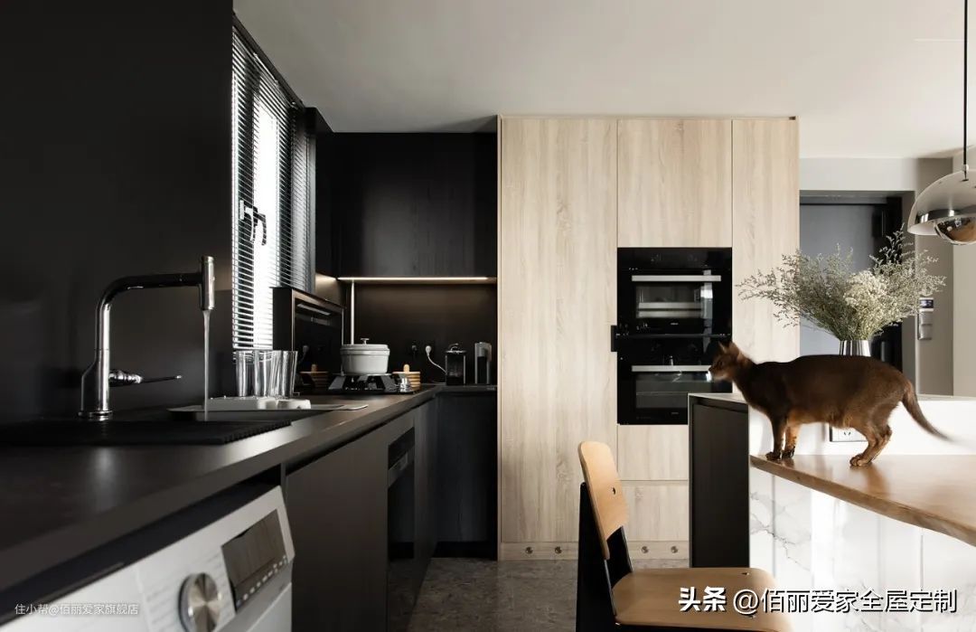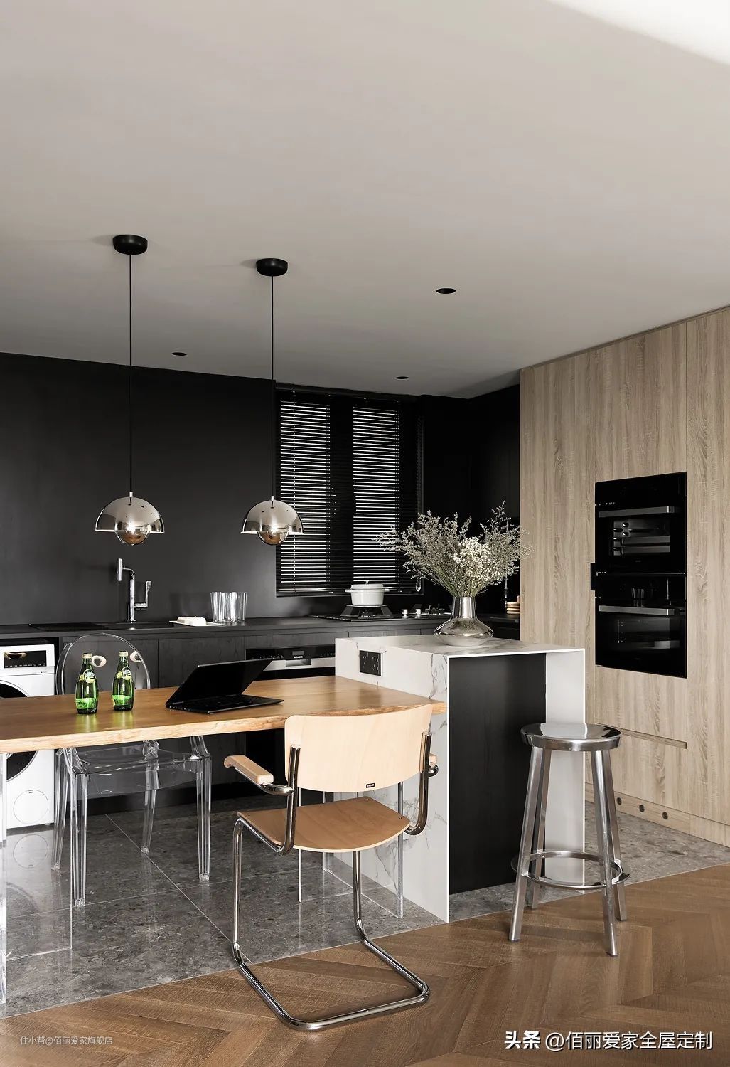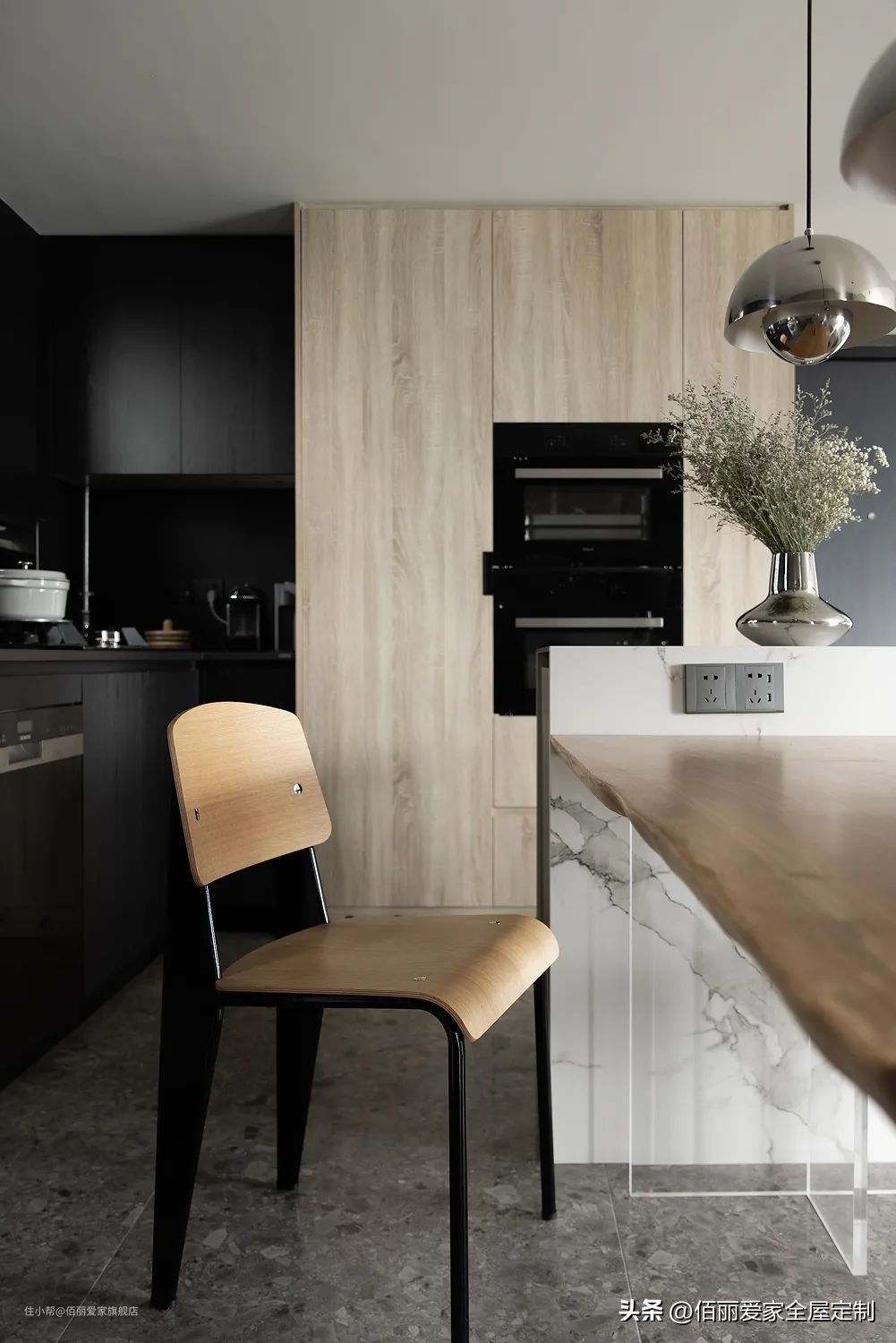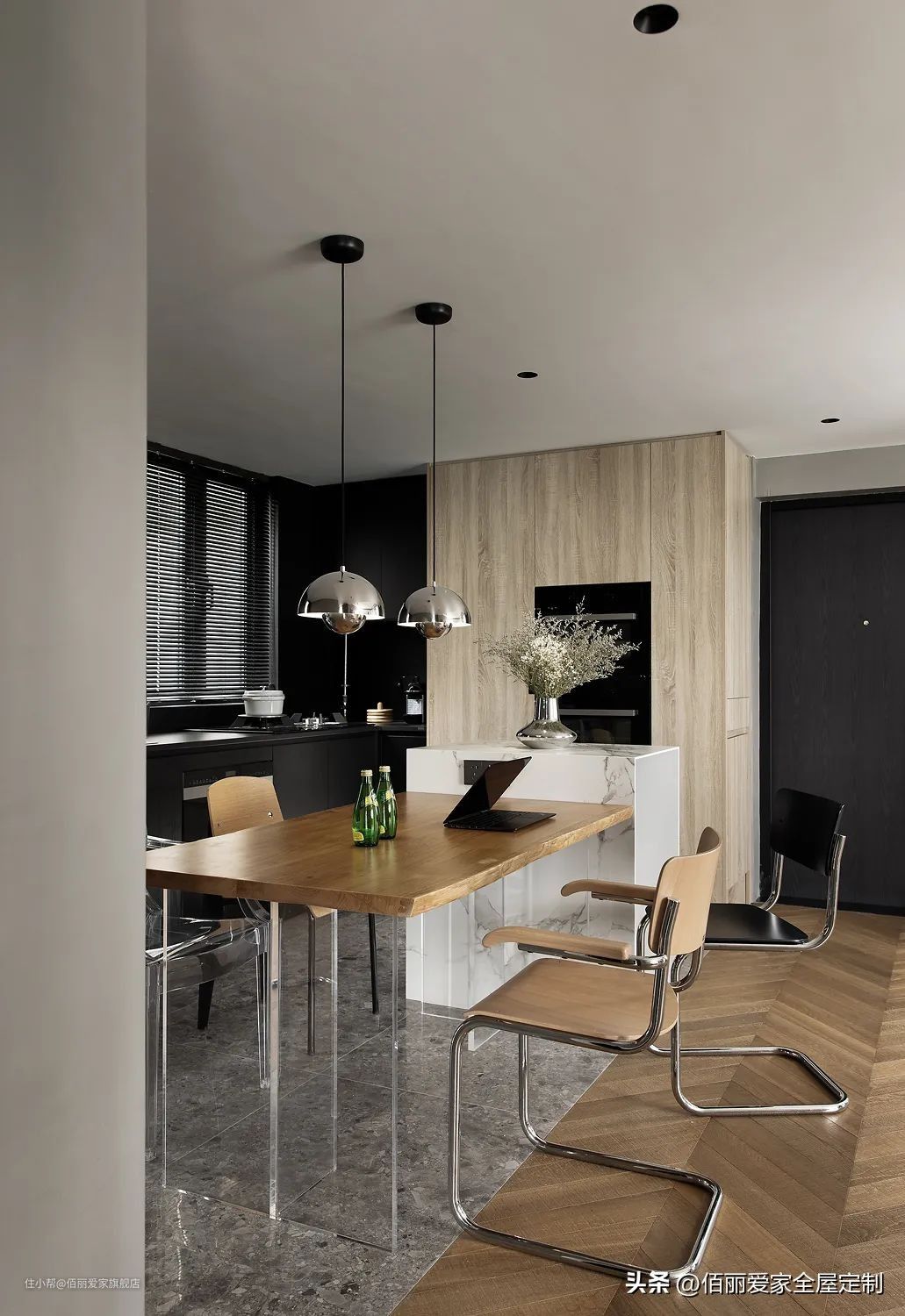 厨房与餐厅的开放式布局,令空间变得开阔舒朗。黑白灰有效调和空间,以随性自由的态度消弭单调,令精神平静,被自然的气息安抚。
