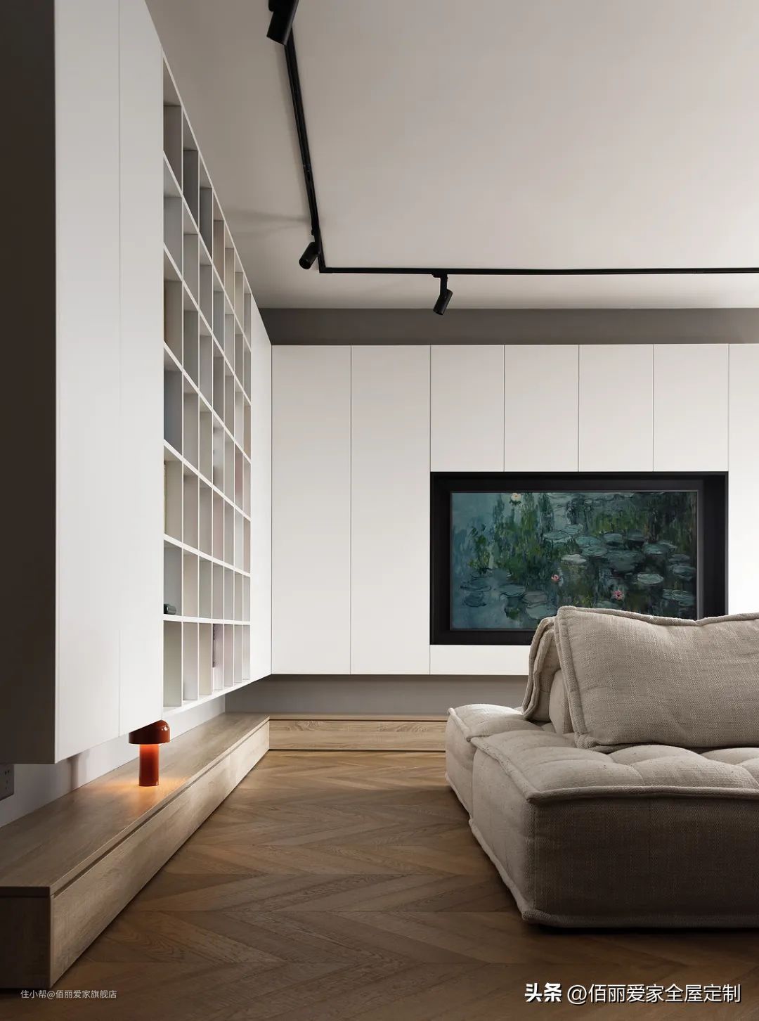 客厅采用无主灯设计,照明均匀且可控,幽柔润泽的光影格调高雅。统一的白色柜体呈现L型合围空间,明细的装饰线条,带来高度统一视觉美感。轻奢简约的审美追求下隐藏着强大的收纳功能,以一种“空”的姿态,直面“满”的生活,细节景致温馨而富有雅趣。