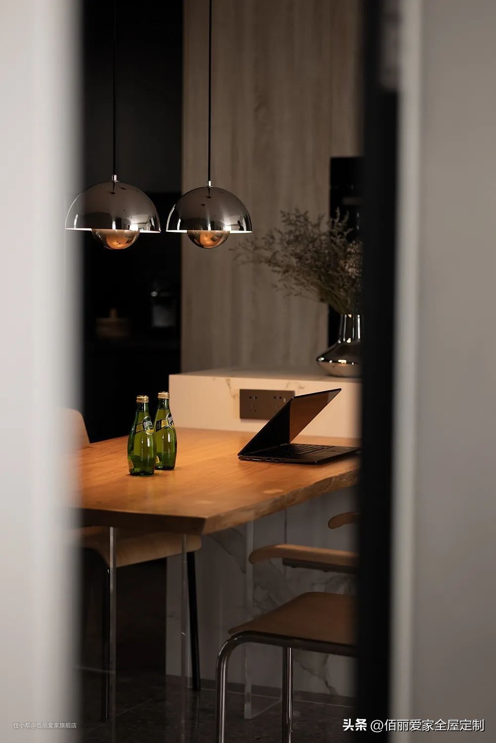 为空间进行过渡的餐桌与吧台,采用亚克力板作为支撑,质感更显时尚轻盈。金属吊灯个性张扬,增添一丝复古的韵味,在时光的打磨下,投射出令人留恋的美好氛围。
