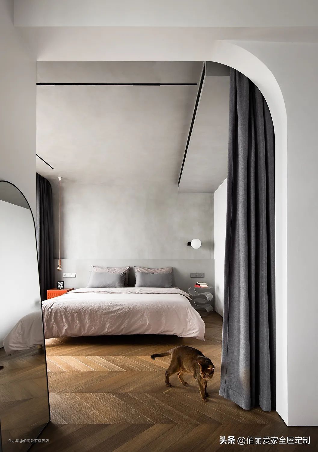 以侘寂风格的笔触,不露声色,勾勒卧室简洁质朴的涓涓禅意。没有过多的点缀与装饰,清透的纱折射微烁的光,流露素净淡雅的生活格调。落地式书架直观的视觉冲击,打造整体空间的层次。窗外阳光洒进屋内,一人一猫一年一岁,渲染平和圆满的生活真意。