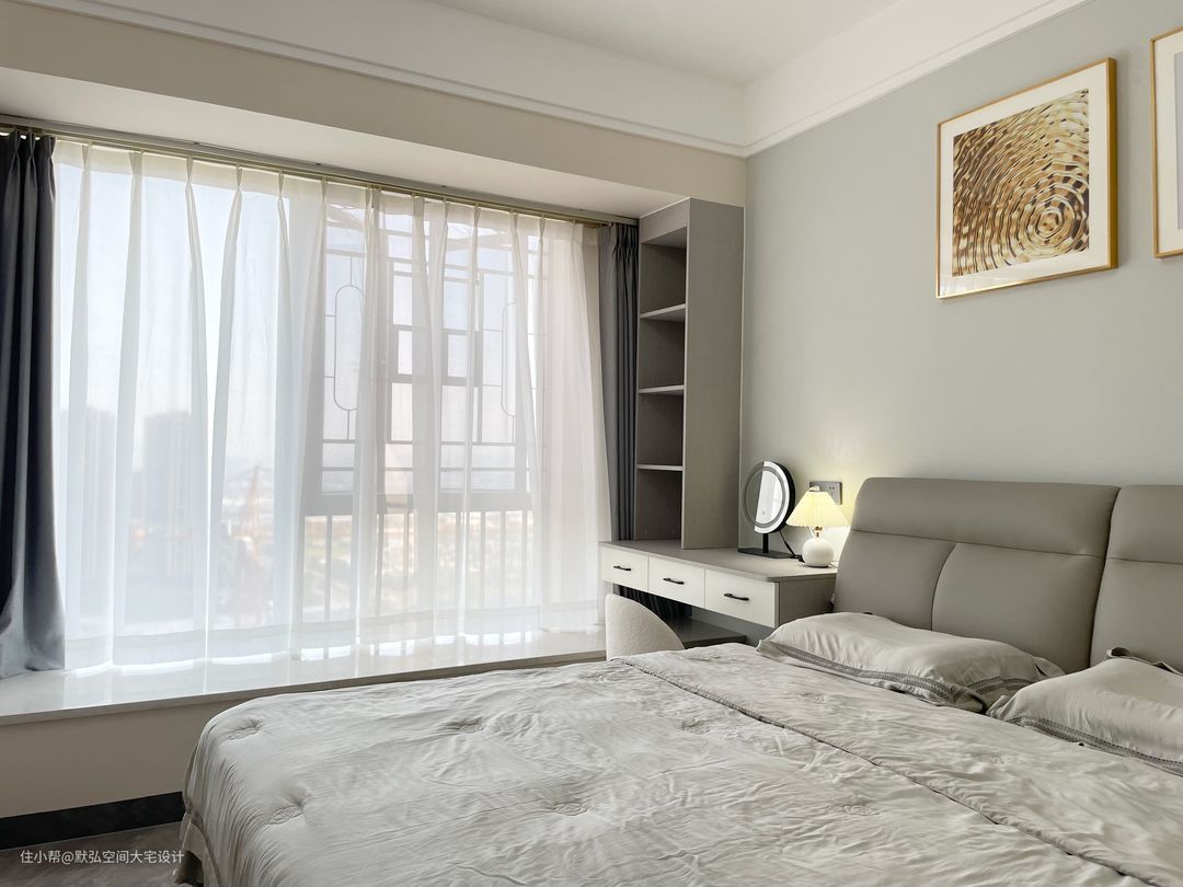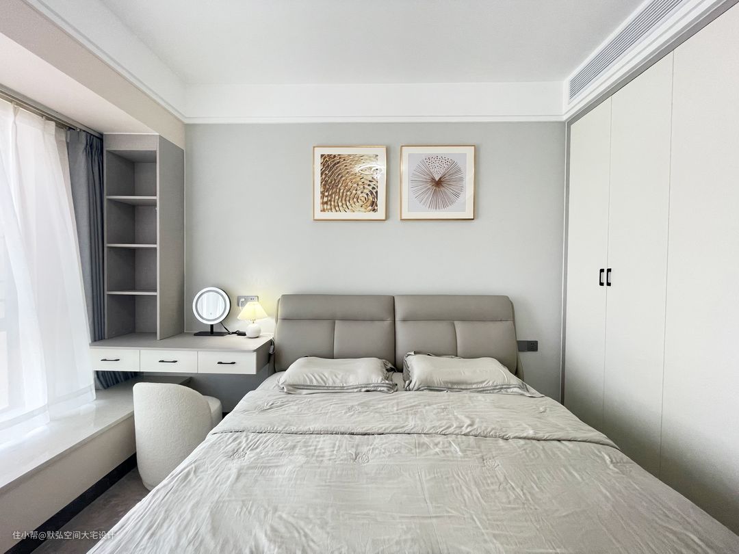 最后设计师巧妙利用窗边柜的位置打造出一个极简的梳妆台,小巧精致,整屋的同色系软装、床品,搭配一抹淡黄色的梳妆凳点亮整个空间,不会显得整个空间沉寂无力,打造梳妆台既不占用过多卧室空间,除化妆外,又能满足阅读、办公等多重功能需求。