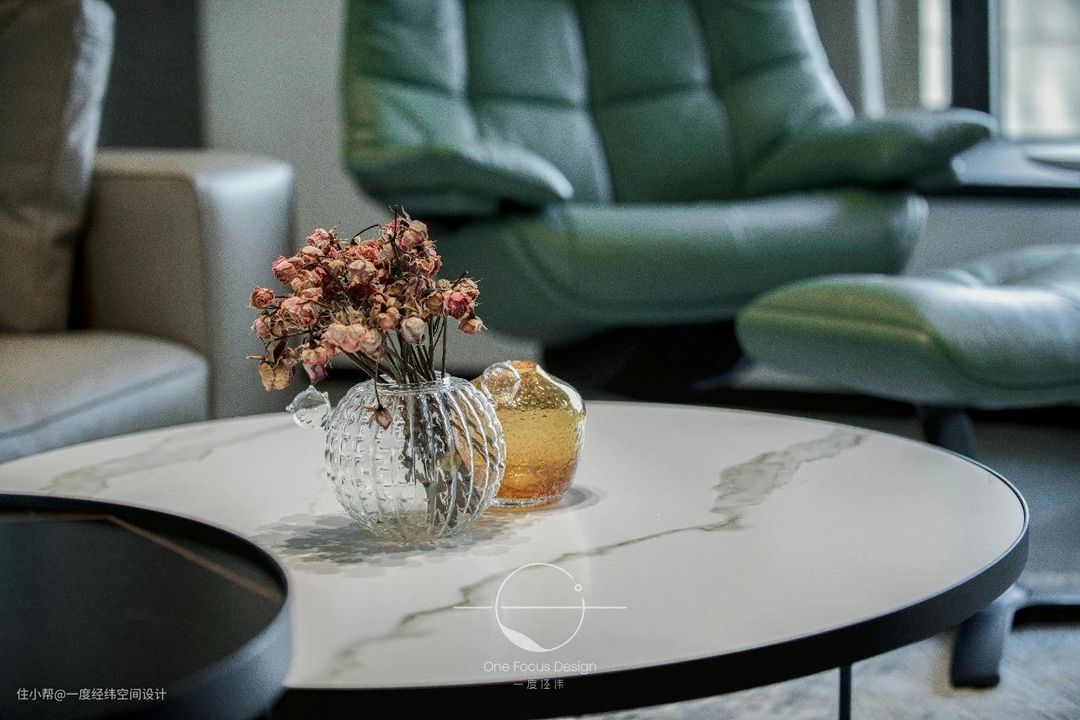 奶咖与墨绿色的组合简约又带一点摩登感,皮质沙发柔软大气,搭配组合茶几彰显精致的格调感。