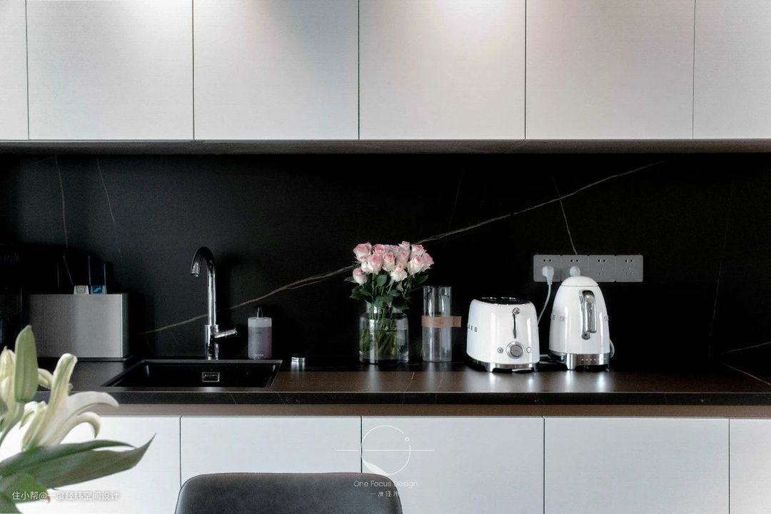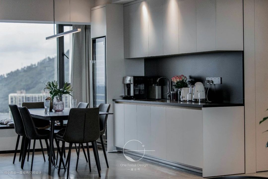 白色餐边柜与黑色餐桌椅搭配得相得益彰,互相映衬。餐边柜丰富的收纳空间能够存放食物、干货与杂物,台面摆放小型家电,整齐又干净