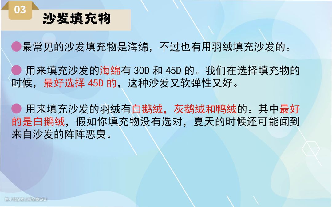 羽绒做沙发填充物,坐感舒适又不易变形,缺点是回弹慢、成本高,且若羽绒种类没有选对,还会使你的沙发充满异味。