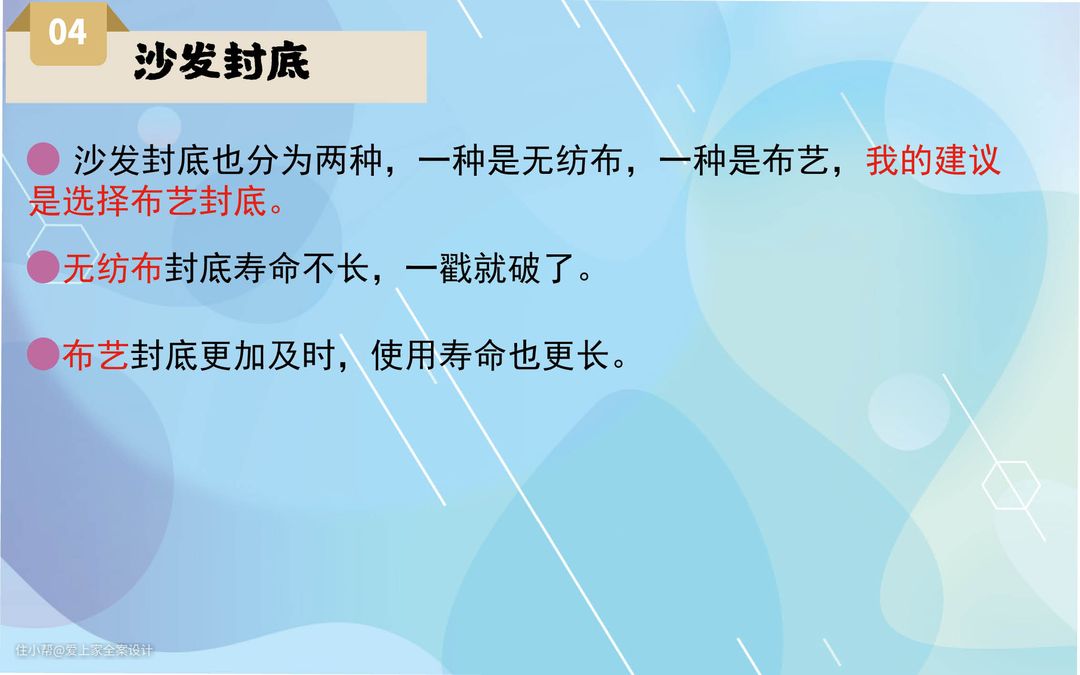 第四点需要注意的就是沙发封底,沙发封底分为两种,一种是无纺布,一种是布艺。无纺布封底很容易破洞,而布艺封底更加结实耐用,建议尽量选择布艺封底。