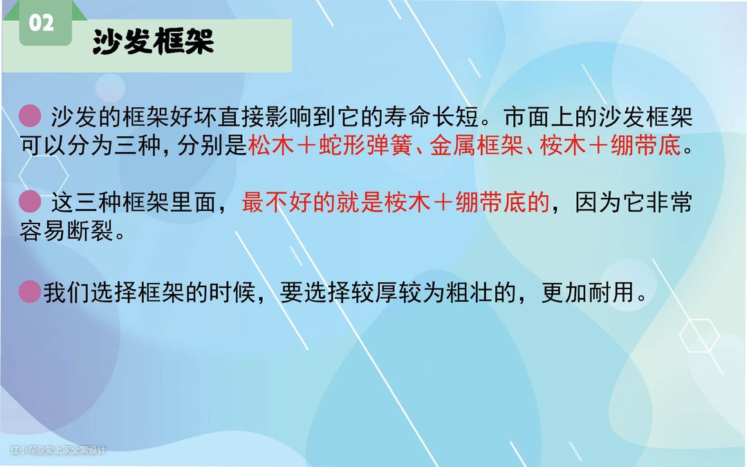 沙发框架首推实木框架+蛇形弹簧,具有非常好的稳固性,能够保证沙发的长久使用且不易变形,蛇形弹簧更是提供了良好的弹性。在各类沙发框架中,最不建议购买的就是绷带底的,因为它不牢固,极易断裂,选择框架时最好选择结实耐用的。