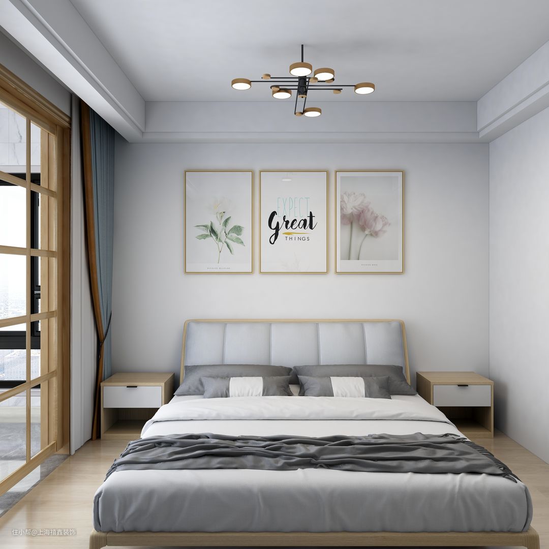 【主卧】主卧延续客厅的风格和色调,遵循简约理念,墙面用绿植装饰画点缀,与床头柜上的绿植相辉映,带来无限的生机。飘窗比较宽敞,采纳外界的光线,呈现出整洁明净的效果。