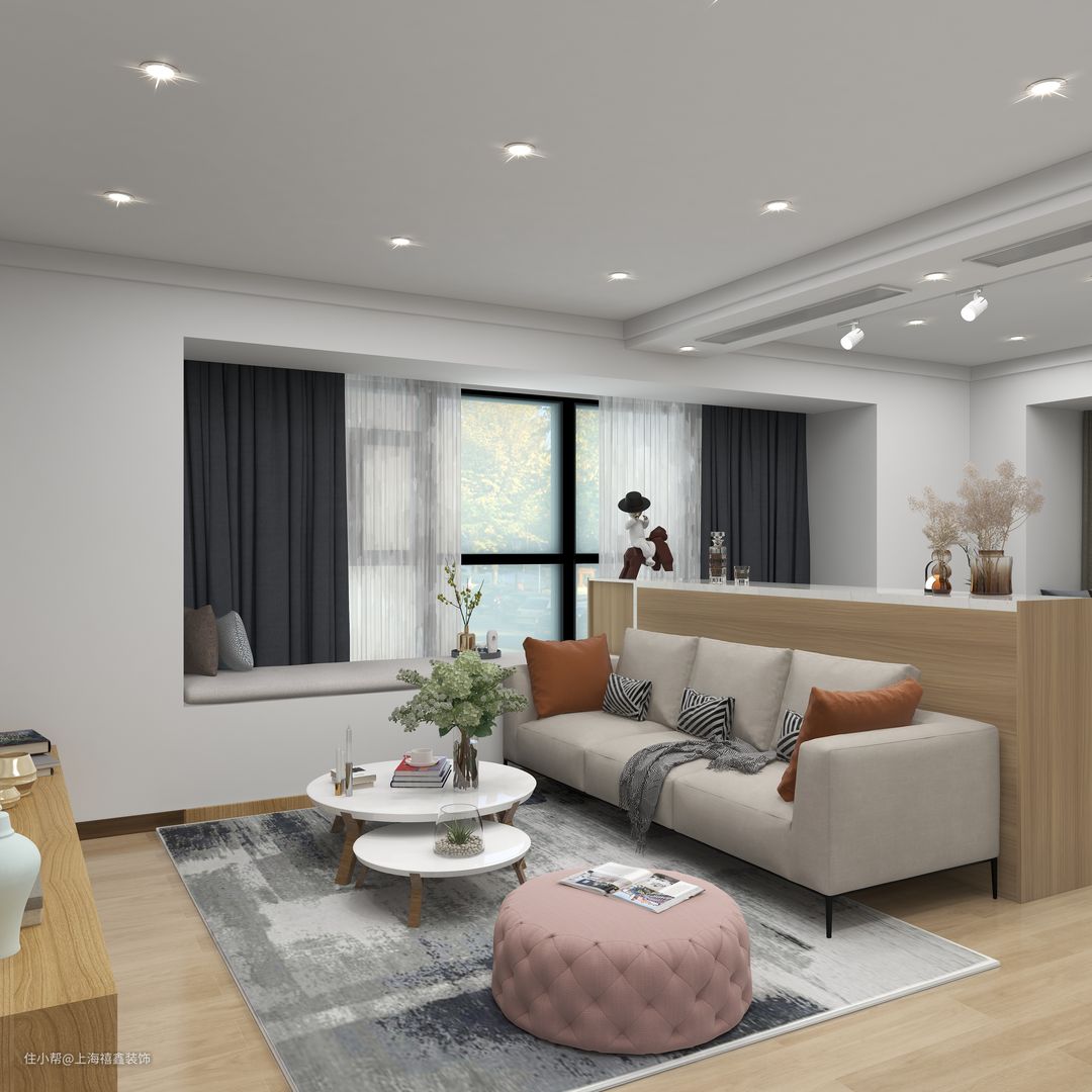 【客厅】客厅的窗子改造成飘窗,采纳外界光线,让整个空间都敞亮起来。细脚的三人座沙发放置在编织地毯上,背靠半墙高的柜子。两张圆形茶几拼接起出层次感,藕粉色的圆形矮凳精致小巧。