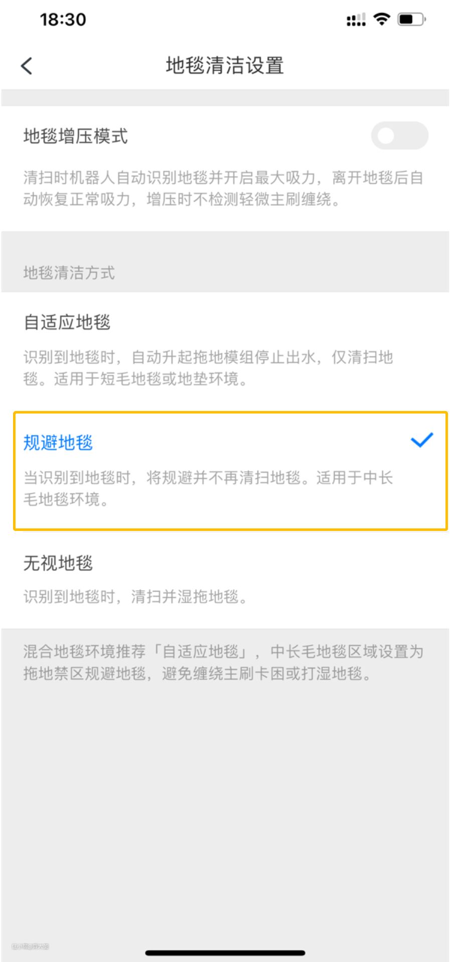 当开启「规避地毯模式」时,机器会主动避让地毯;