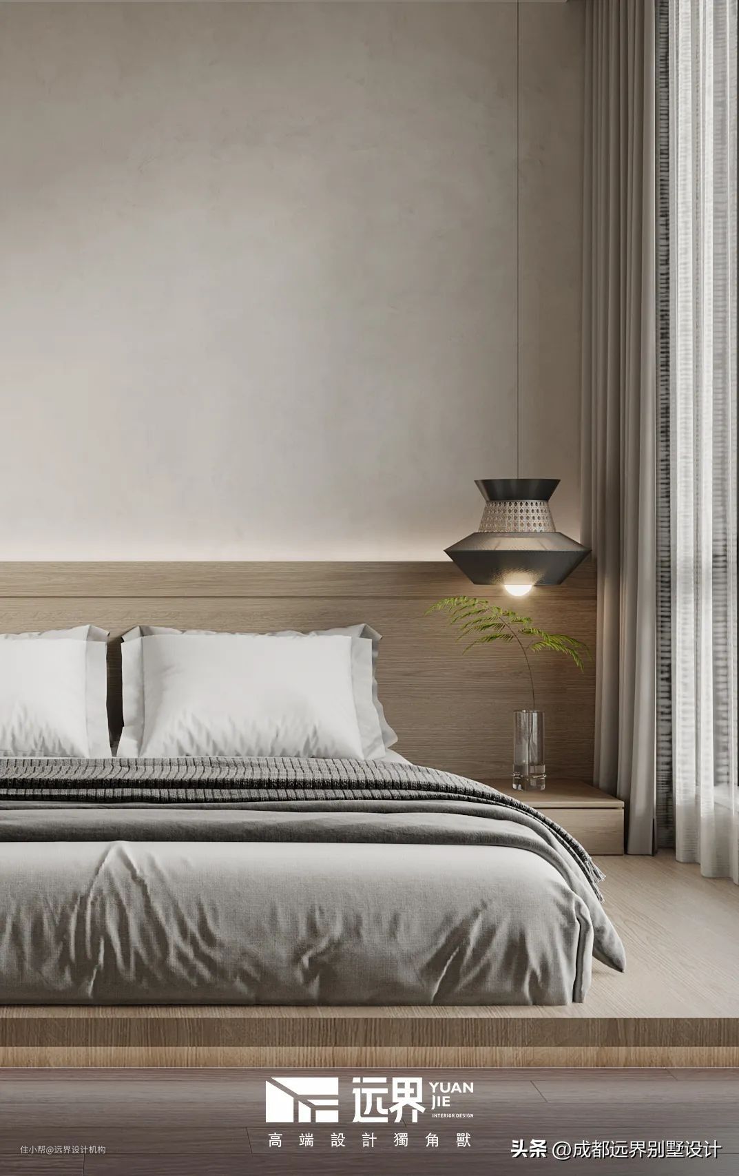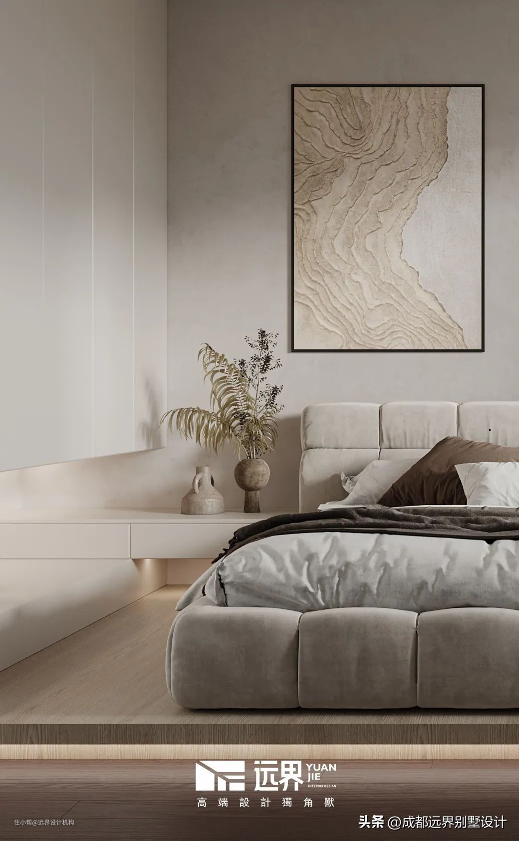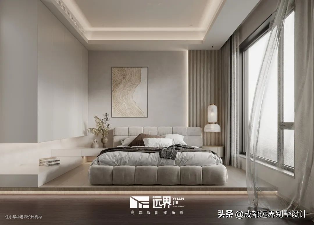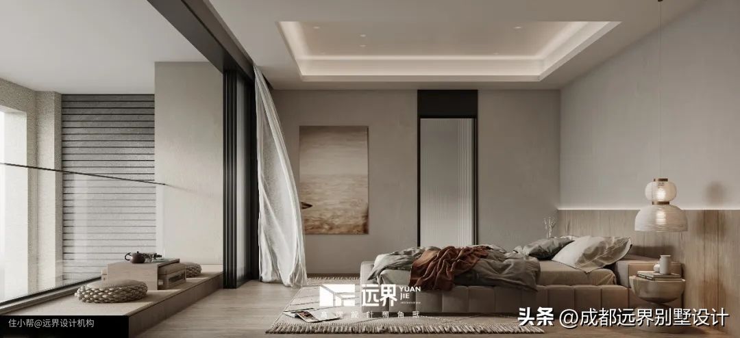 客卧以细腻的质感带给人前所未有的平静,物与物之间自然流畅的过渡。柔和的灰棕色调,极简的线条与舒适的织物,目及之处给人以放松惬意的感觉。