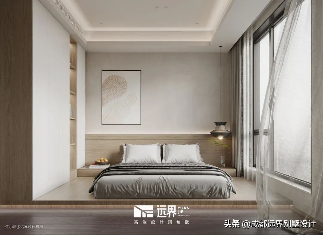 主卧在舒适与雅趣之间寻得平衡,内敛且沉稳的色彩拥有安定人心的力量,所有的情绪都在这里得到舒缓。地台区域做了饮茶,居者席地而坐,使得心绪更放松与自在。