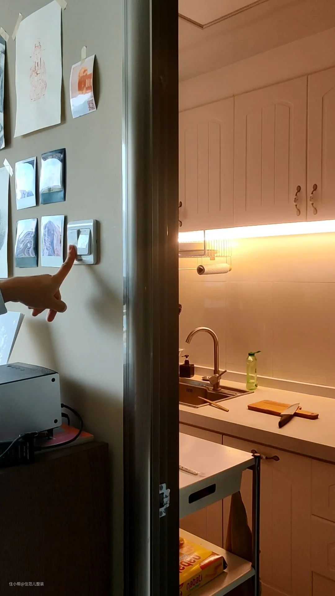 厨房只靠顶灯照明,还不如在吊柜下面装一条灯带,用作厨下照明,不开大灯也完全够亮,切菜洗碗反而看得更清楚了!