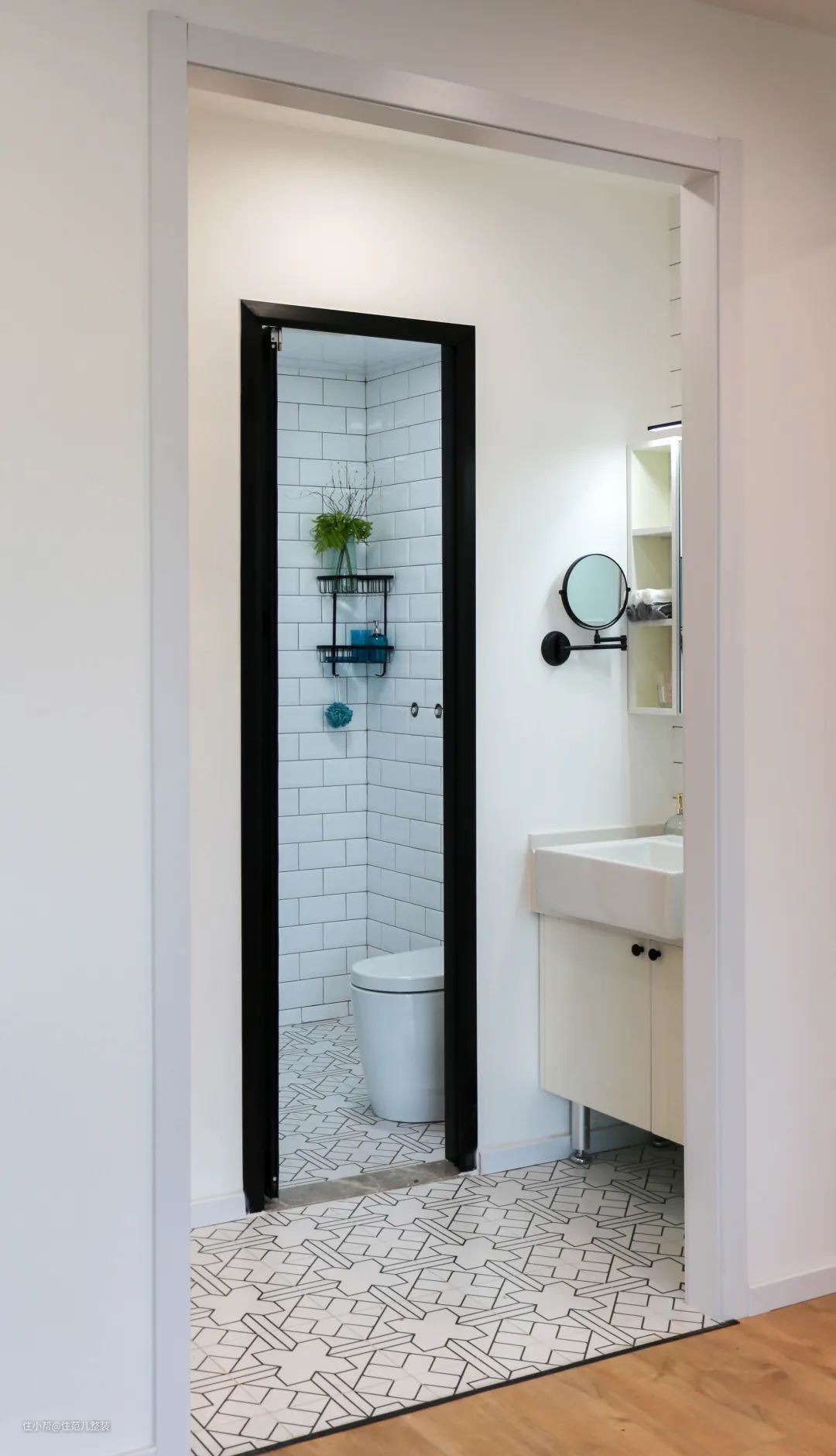 瓷砖和瓷砖之间不需要铺门槛石,镶2.5cm铜条,轻奢优雅,省工省料;瓷砖和木地板用3cm黑色收边条收边,简洁利落又省钱。