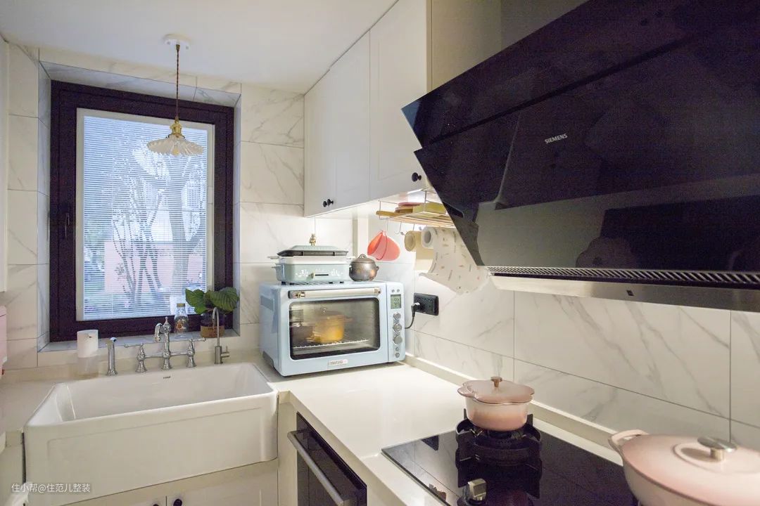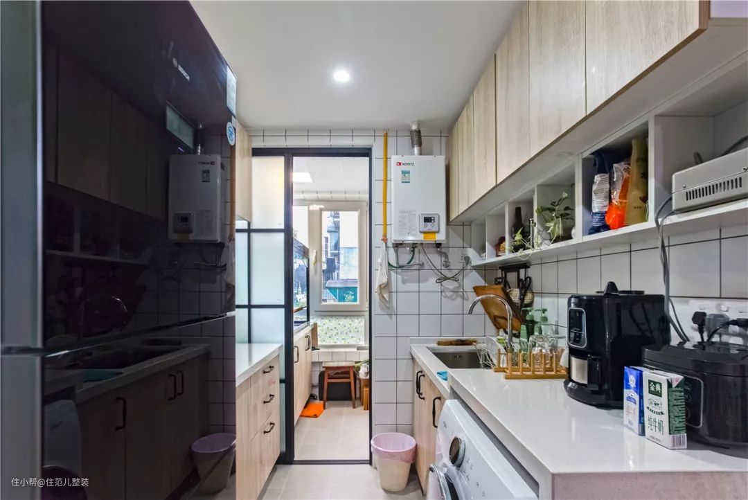 住范儿客户W先生的厨房,用水区域的台面高90cm,用火区域是80cm,冰箱旁的备餐区域是85cm,这样更适合夫妻俩的身高习惯来使用。