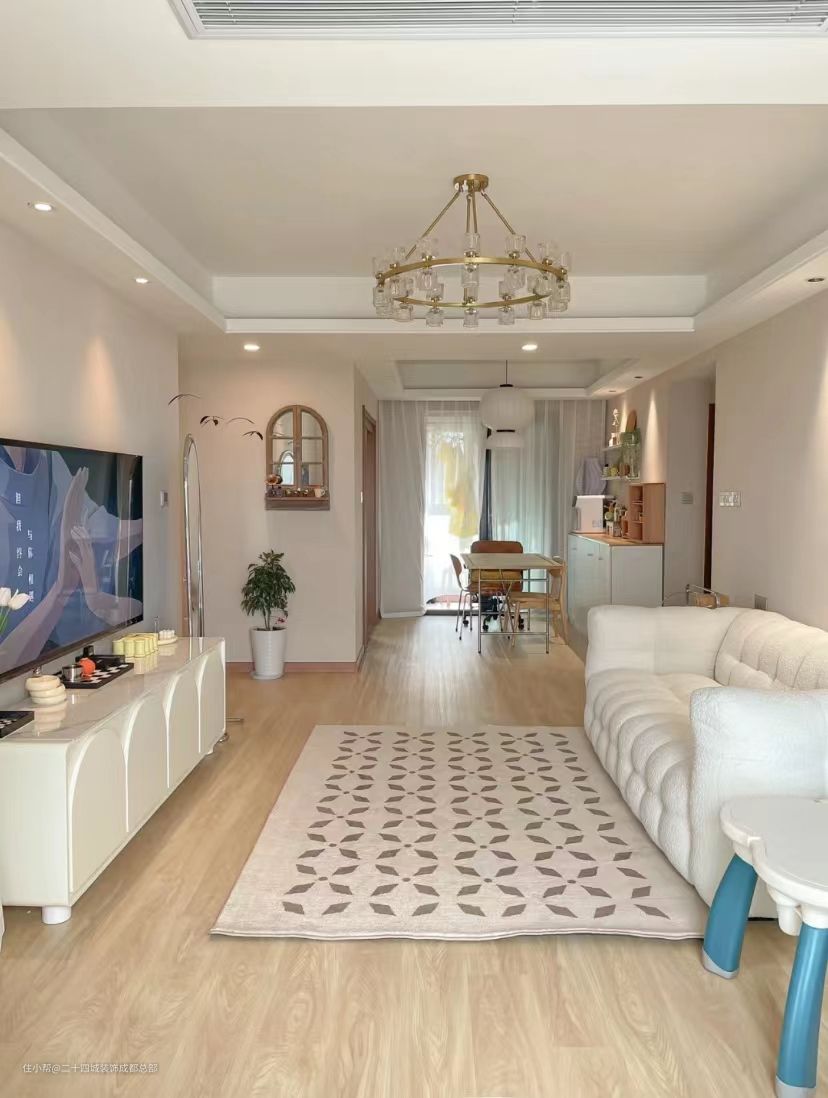 地面的地砖是原本精装房自带的,已经不再流行的波打线造型,将地面分割得非常的零碎,对于户型面积并不大的房子来说,是在是有些尴尬。女主在网上买了一张ins风的地毯铺上,可以在一定程度上增加地面的整体感。