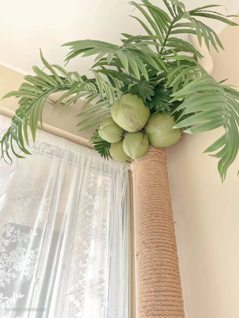 麻绳可以分成10米一段一段地缠,否则绕来绕去很麻烦,在水管背后用热熔胶枪固定,新的麻绳覆盖住接头,接头就不会很明显;从下往上缠的,缠到上面还剩60,70cm的样子,把树叶包进去缠,按照自己的喜好去放置叶片的位置。从上往下:0.9m—0.46m-1.1m这个顺序排放的。最后把椰果固定上去,一颗椰子树就绑好了!