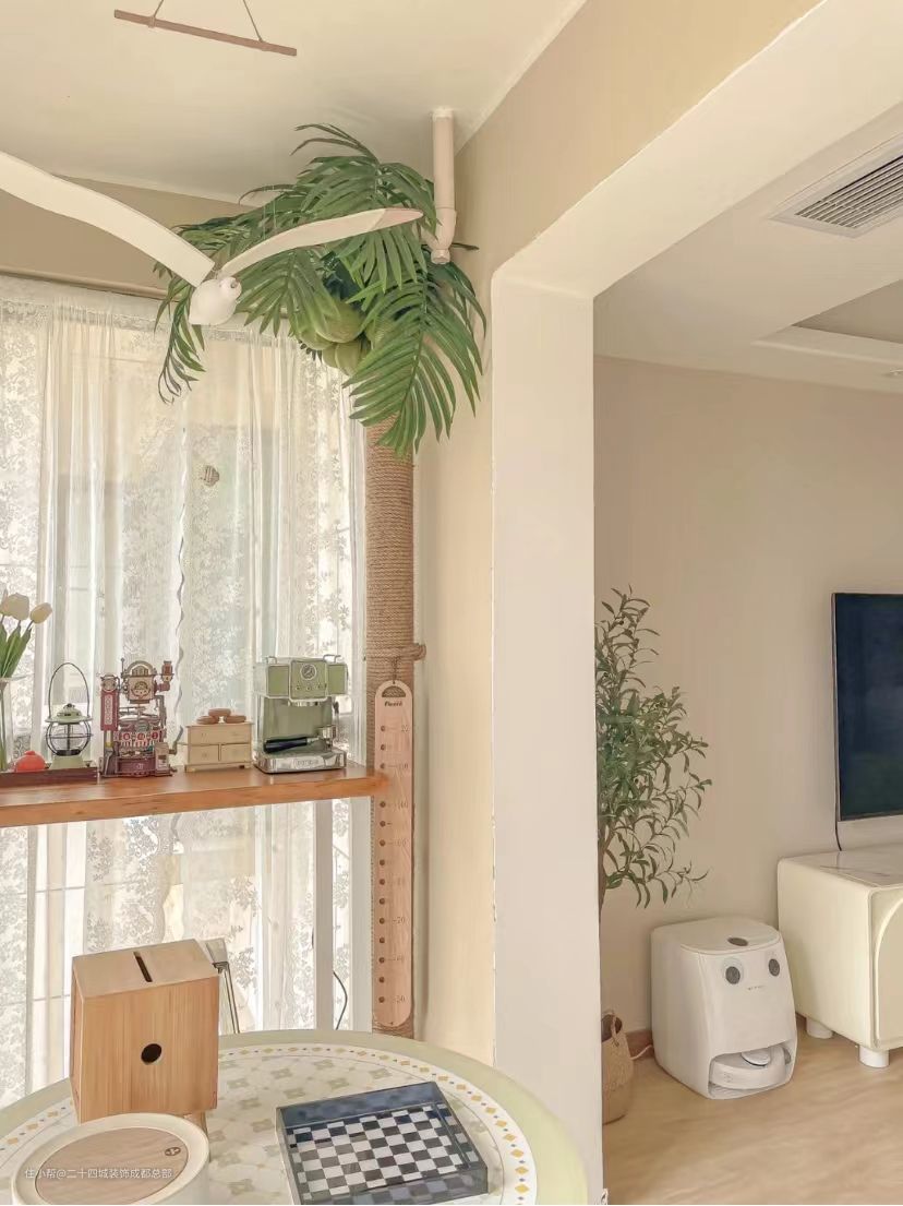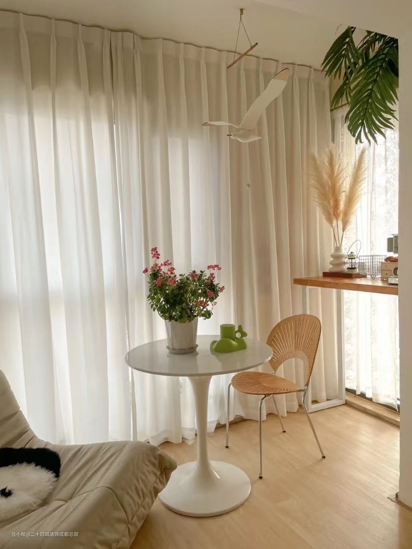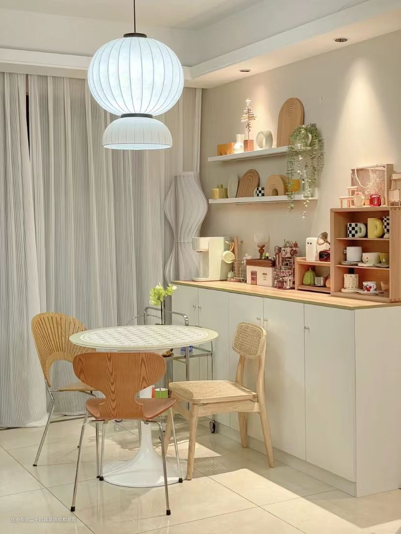 平时在家吃饭的机会不是很多,大餐桌的话,反而会显得有些顾忌。用一张小圆桌代替小圆桌,坐这里喝杯水,靠着小圆桌坐下,很有氛围感。