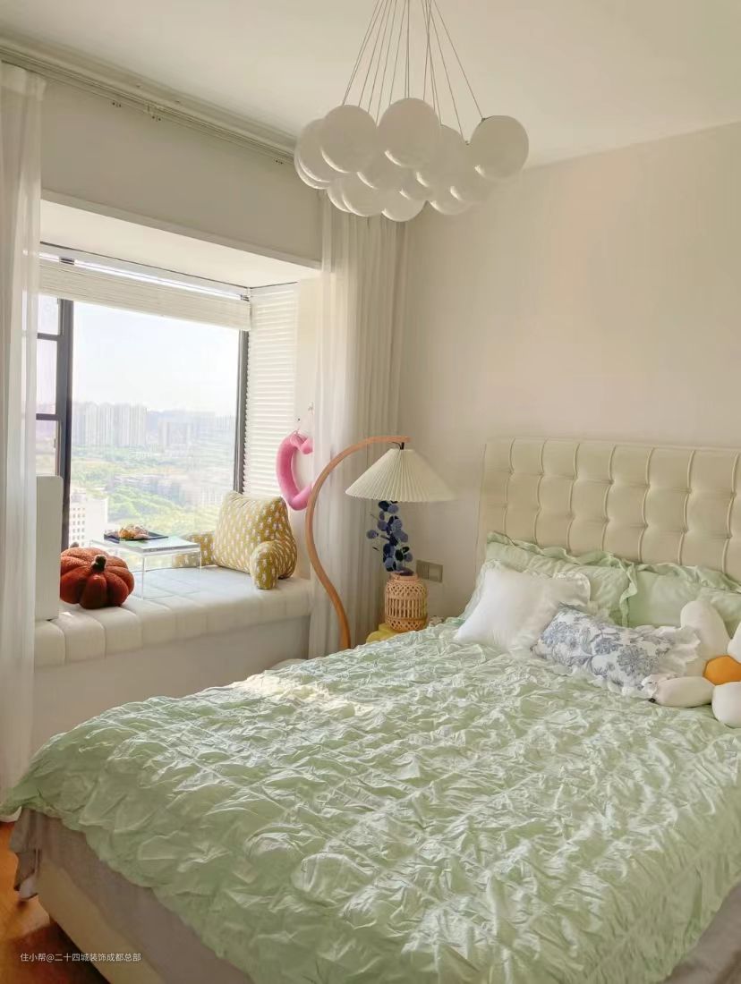 原本的主卧其实是深色系的,总觉得有些暗淡,女主把床头背景墙上的硬包和格栅木拆除后,用简单的白色乳胶漆重新刷了一遍,卧室总算亮堂起来了。