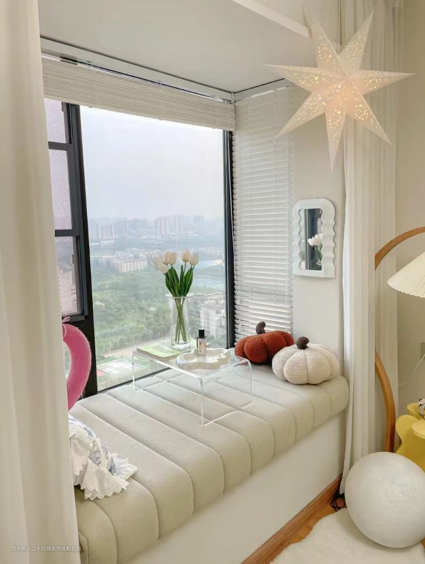趁着休息,把飘窗改成了“小沙发”,拆掉防护栏,拆除的孔用画挡住;装了木百叶,分解阳光。