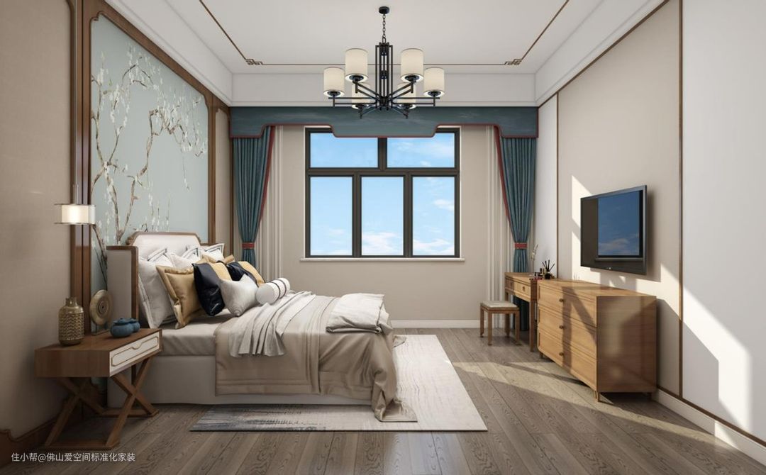 整体装修以浅色为主,有着一种清爽自然的感觉,没有太厚重的颜色。大面积流畅走线,主卧床头背景墙使用了一整副的梅花壁布,相互呼应的中式壁灯、精致的摆件。床尾放置斗柜,上方挂电视,靠在床上看给电视可谓是很舒服的享受了。