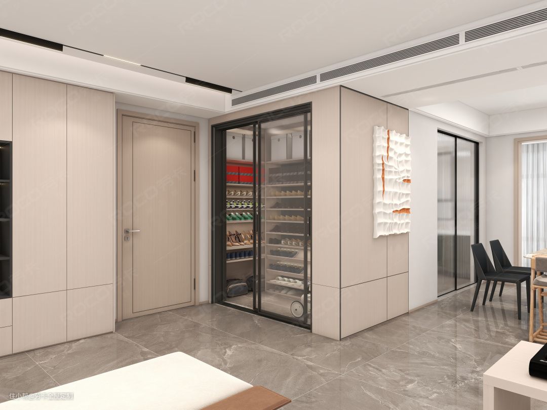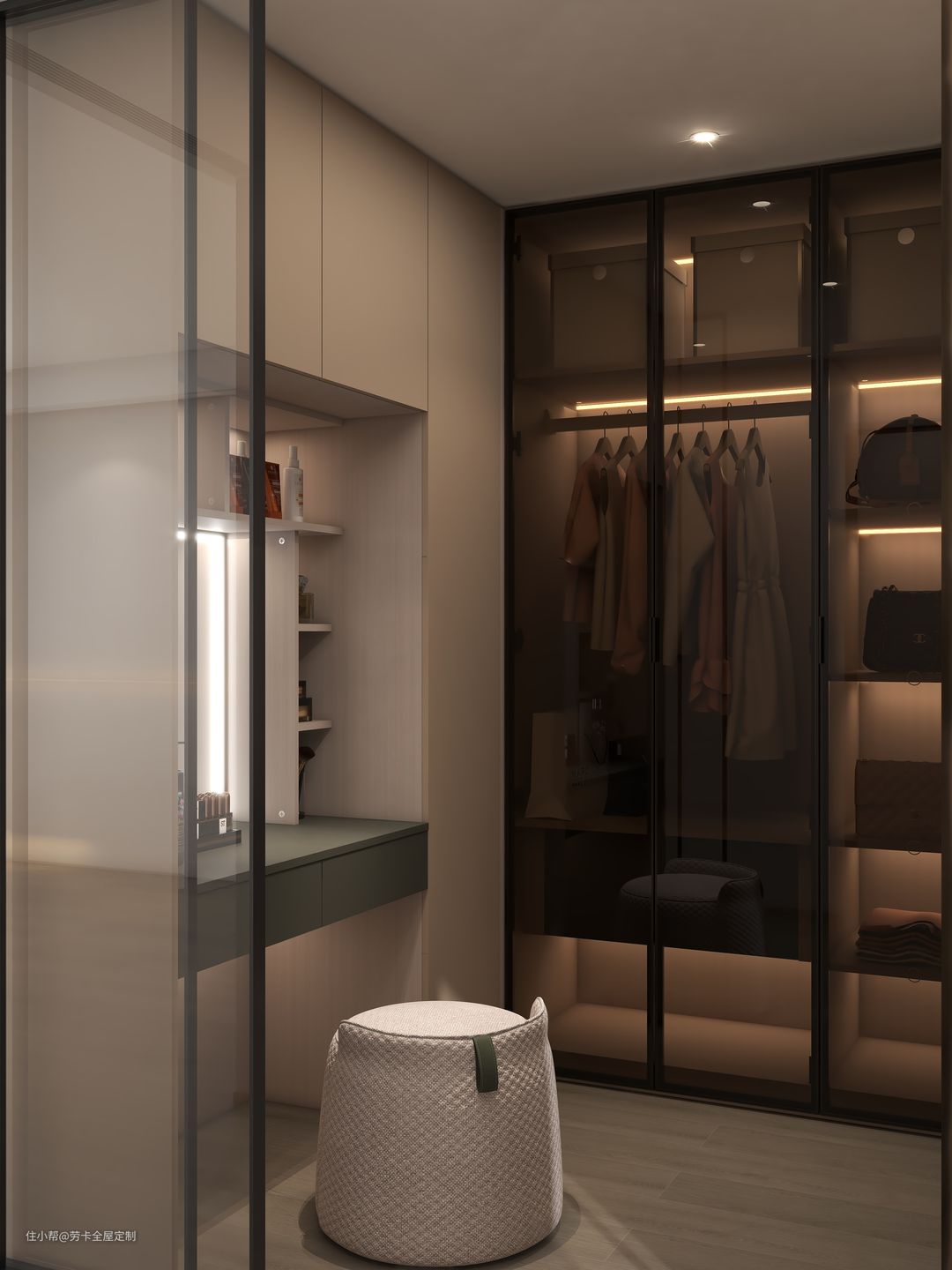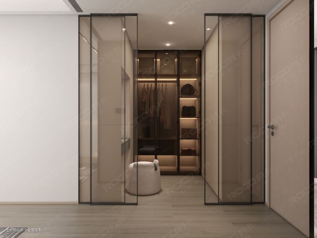 @晓琪最喜欢的空间——衣帽间,衣帽间以玻璃门作为隔断,既能保证各空间的独立性,又提高了空间的通透性。