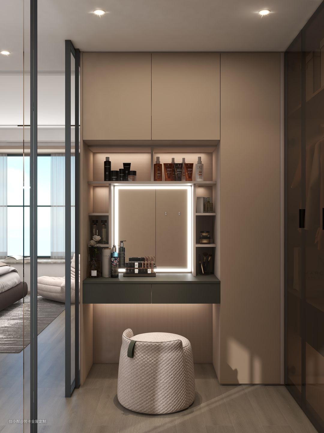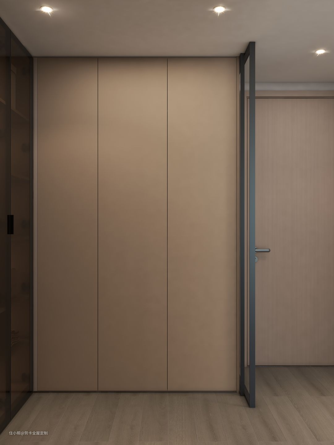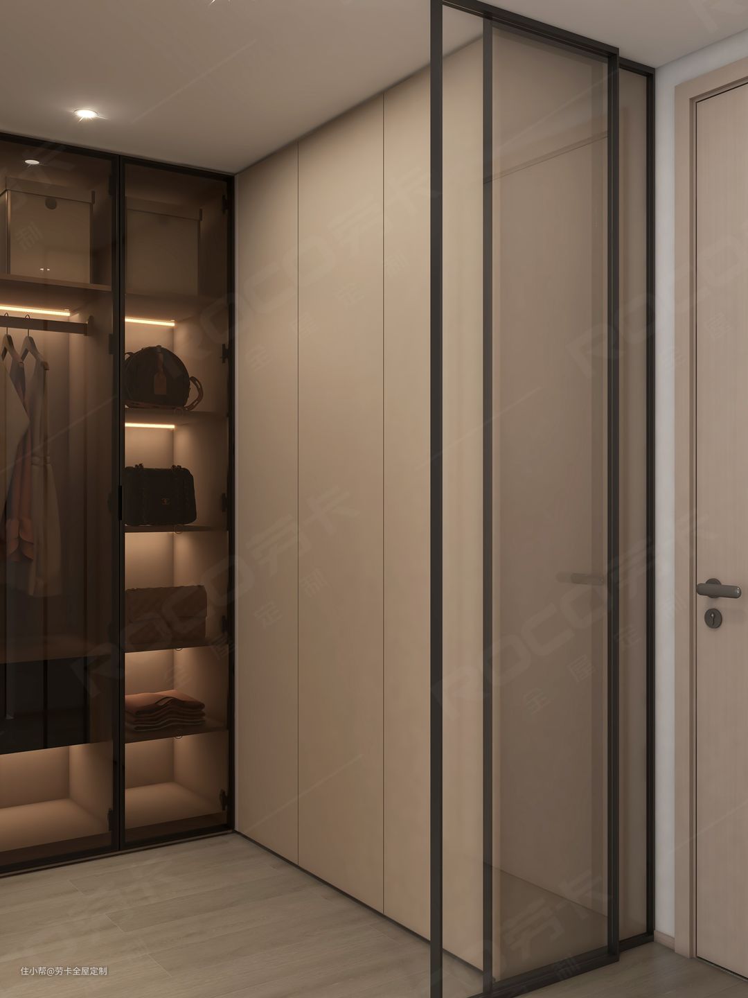 @晓琪最喜欢的空间——衣帽间,衣帽间以玻璃门作为隔断,既能保证各空间的独立性,又提高了空间的通透性。