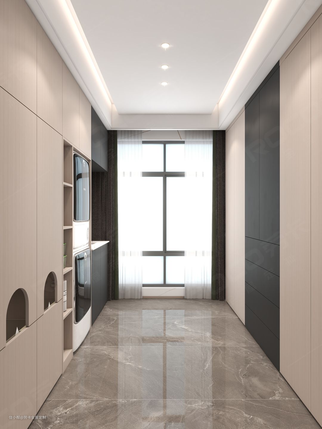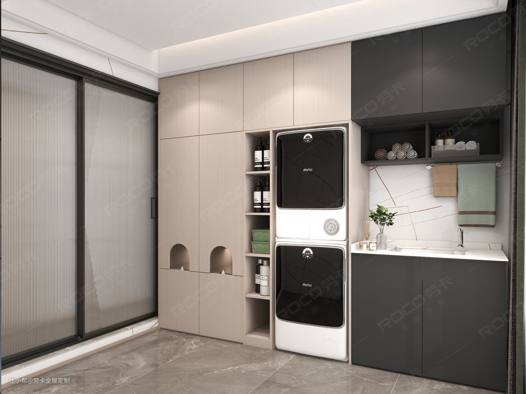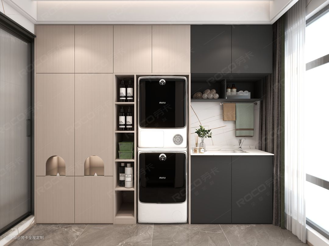 嵌入式柜体设计将洗衣机和烘干机完美嵌入柜体中,真正做到不浪费每1㎡的空间;另外一侧全封闭的设计,将打扫杂乱的日常用品全都收纳其中,美观整洁。