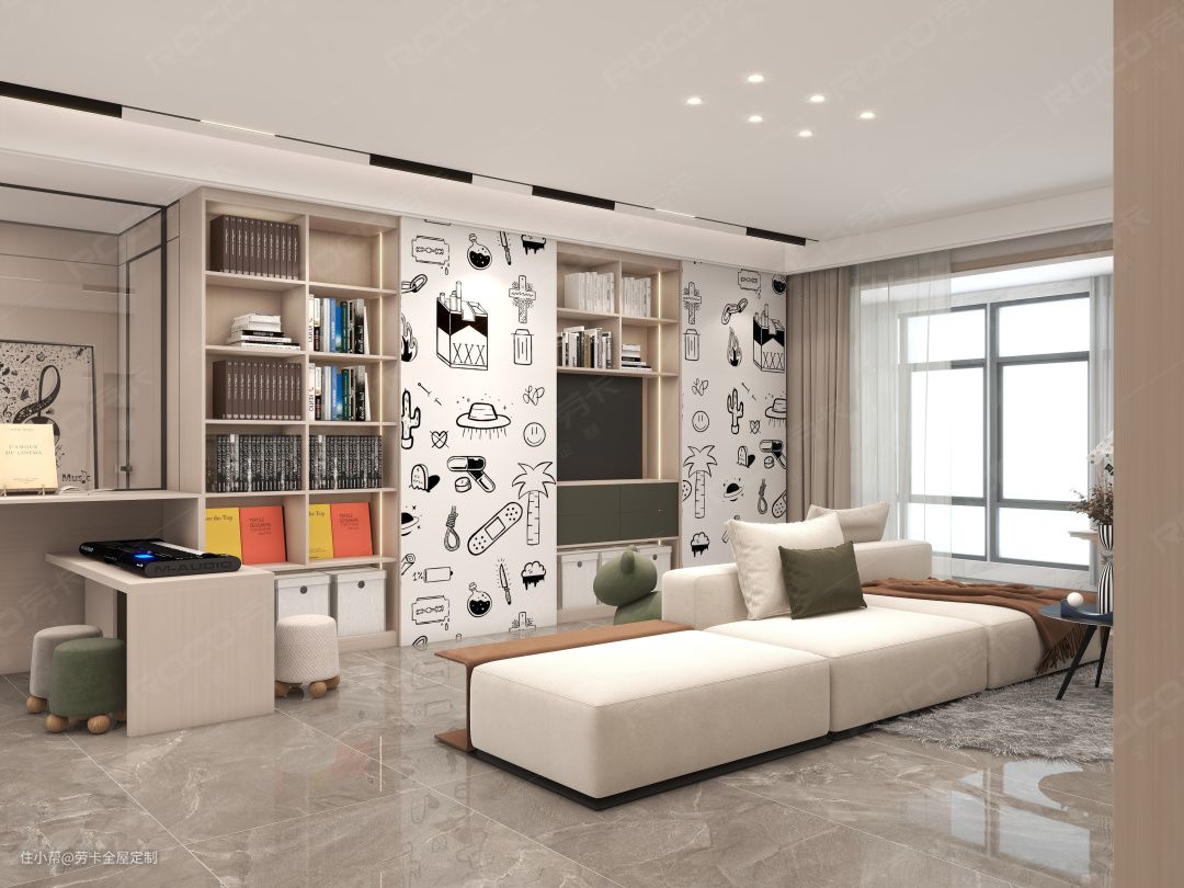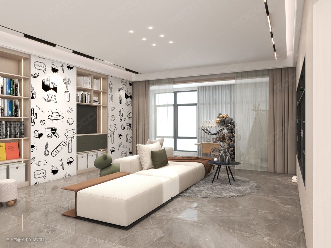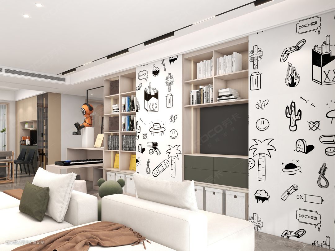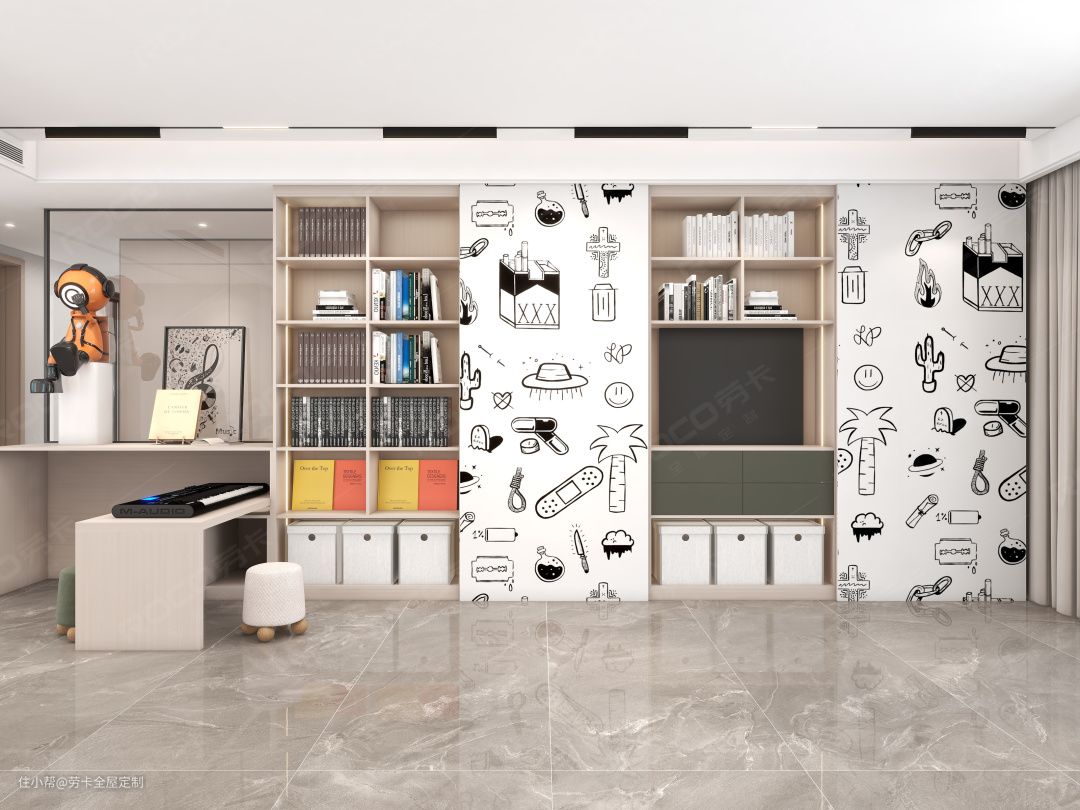 基于对收纳需求的考量,客厅另一边的背景墙也以柜体的形式呈现,强大的收纳力征服全场。半开放式柜体,搭配童趣的墙纸装饰,让空间显得俏皮了几分。