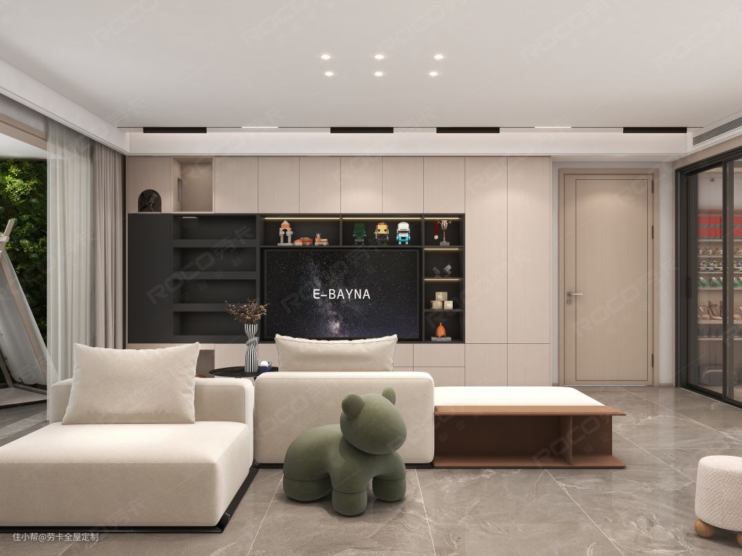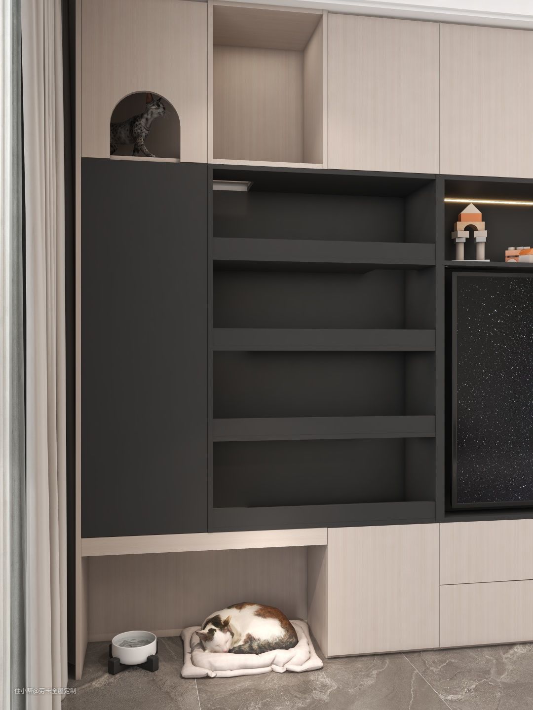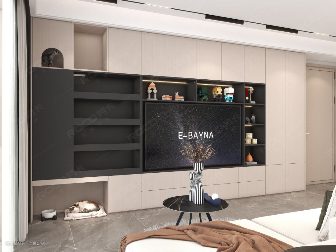 入门处设计整墙电视柜,搭配开放式展示柜,让潮玩手办尽情展现,左侧融入设计猫咪活动空间,让它们在公共区域能尽情撒欢。