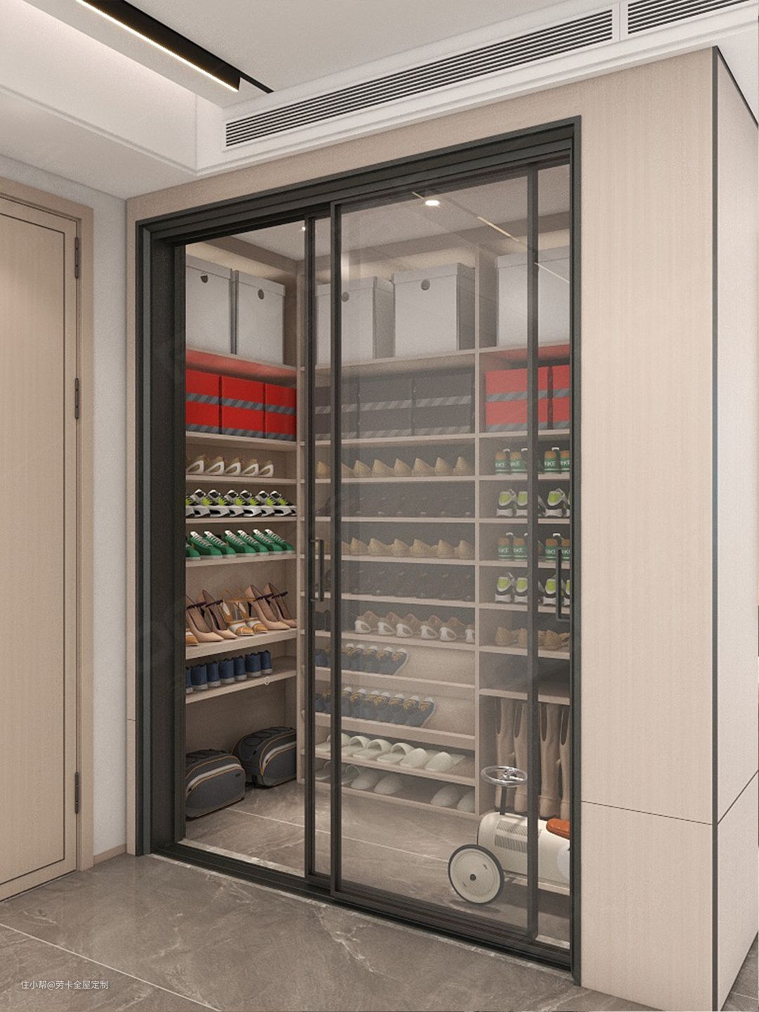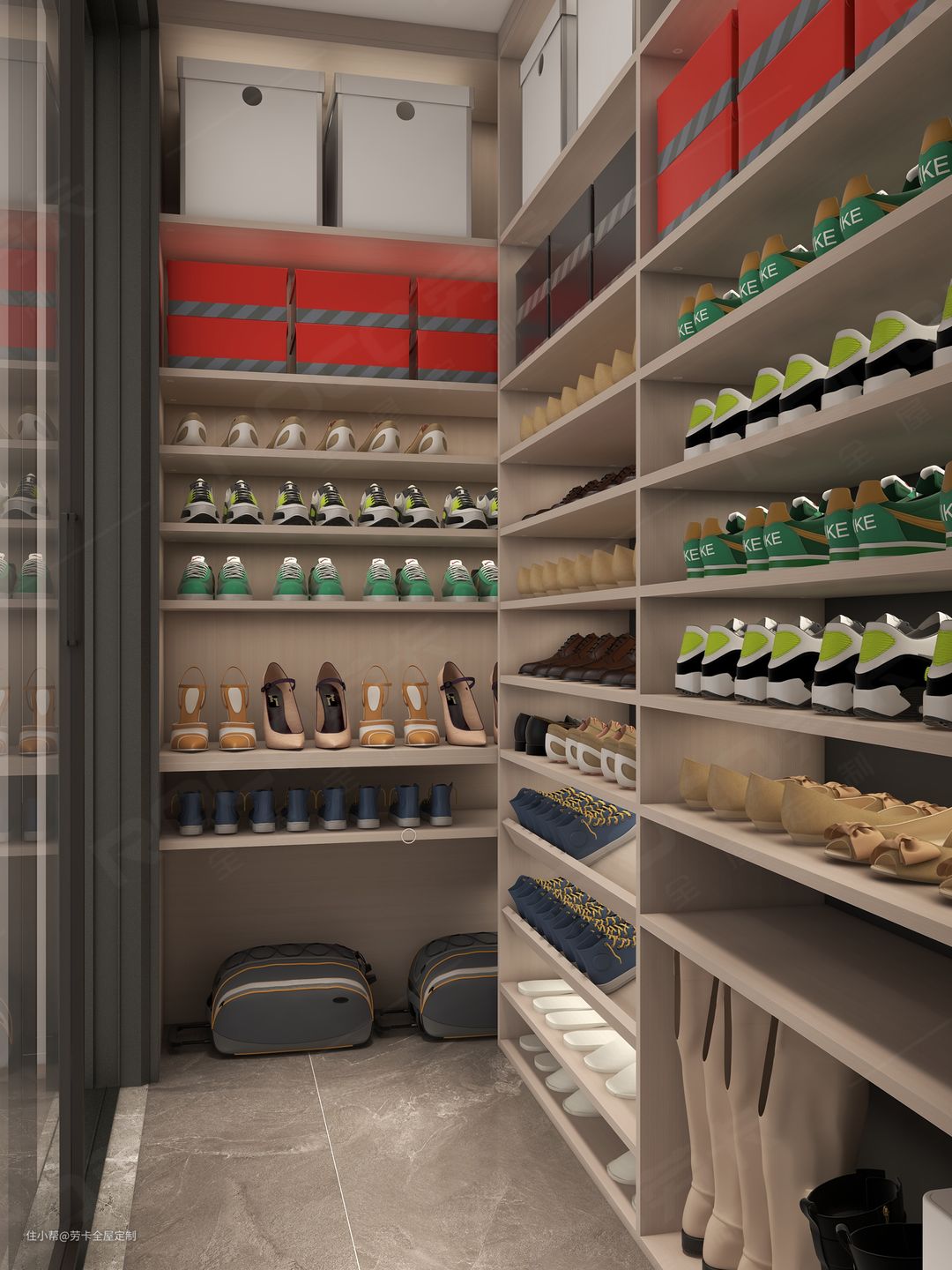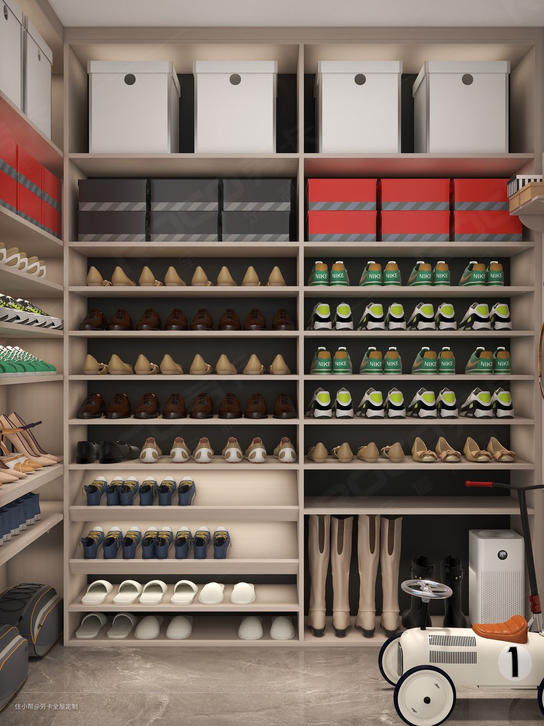 整体采用开放式的设计,潮鞋一目了然,既赏心悦目又能快速选择今日穿搭的鞋物,设计师对于两边空间也没有放过设计收纳。