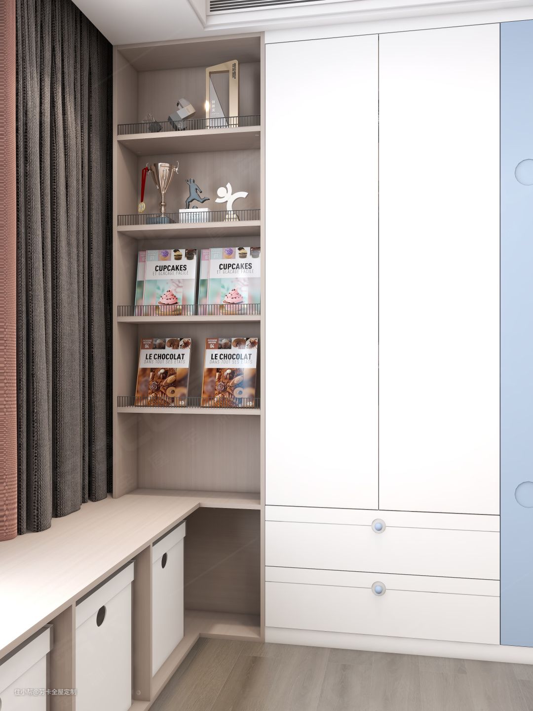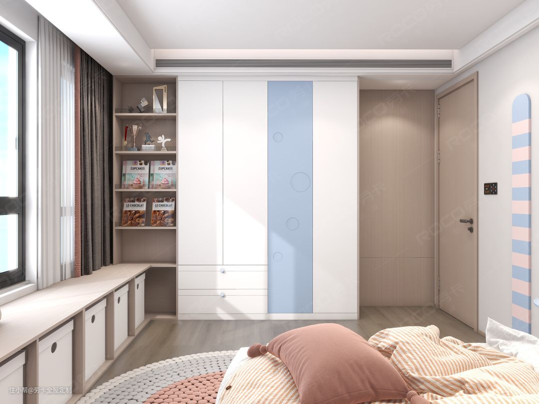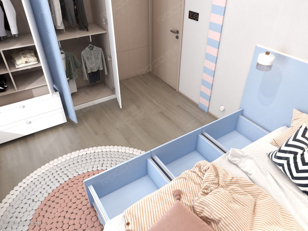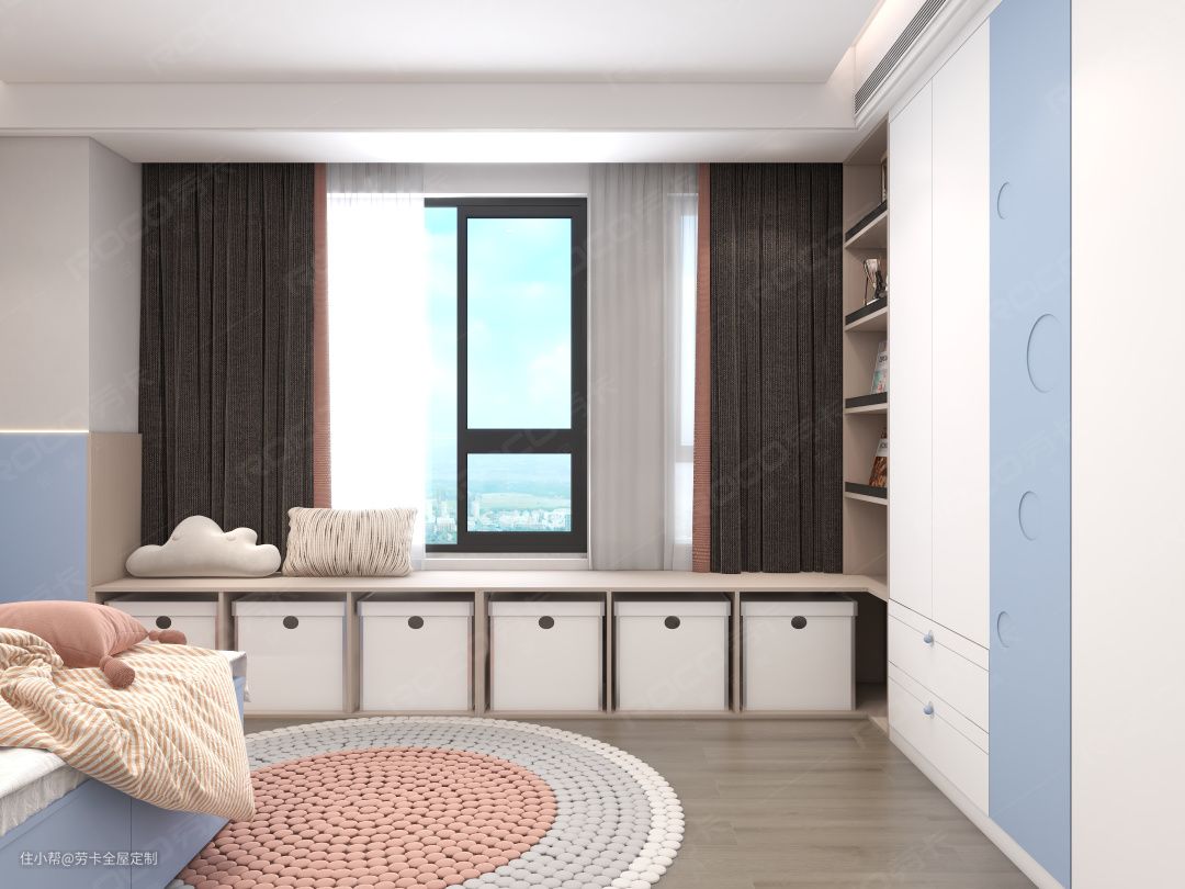 考虑到有娃的孩子很需要收纳空间,抽屉式榻榻米,既能成为床铺,抽拉设计还避免上翻门板取物麻烦,让物品拿取方便。