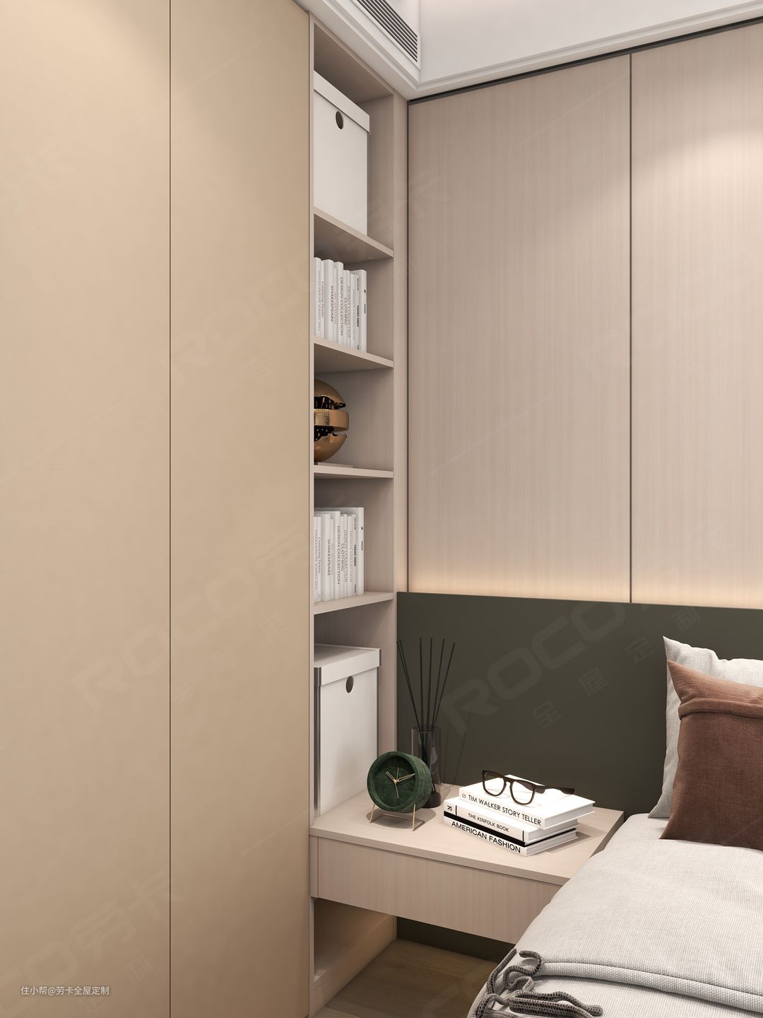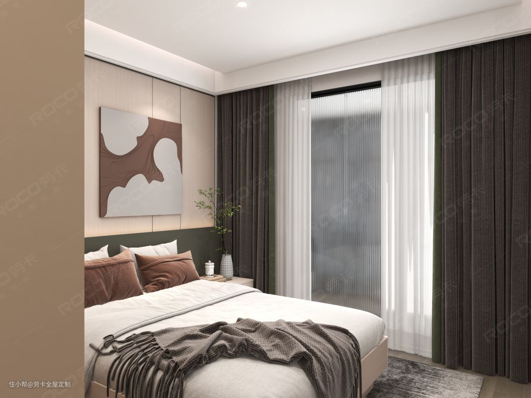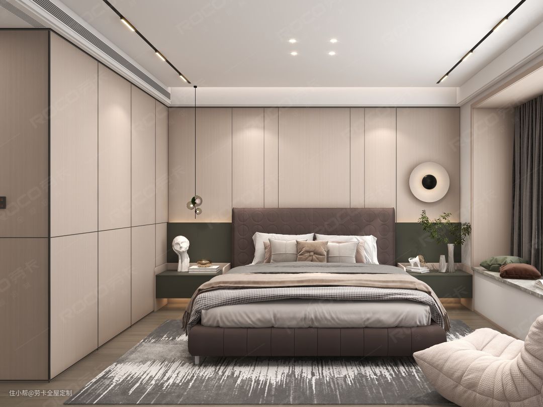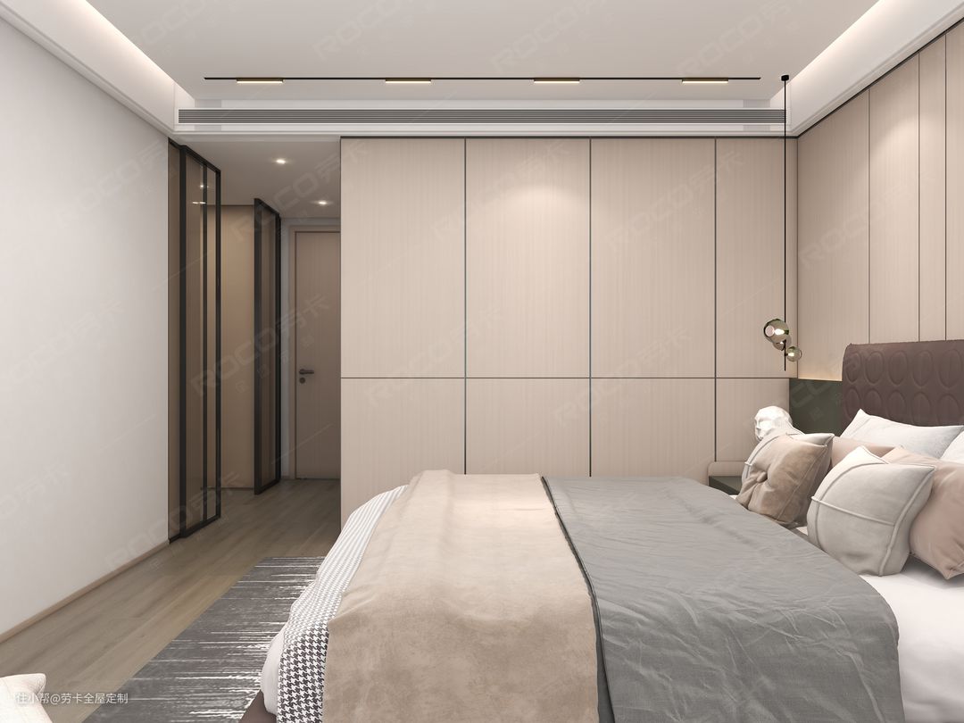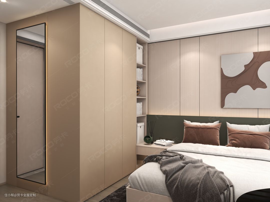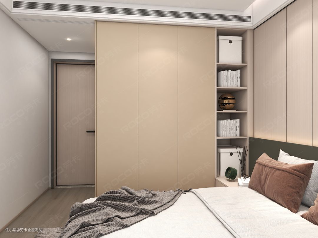 基于对整体空间功能性和舒适度的考虑,次卧靠近动区整体布局设计成”床+床头柜+衣柜“的传统布局。这样不仅能做客卧使用,还能坐拥超强的收纳力。