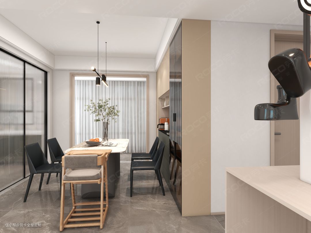 袁先生有收藏美酒和一些国外饮料的爱好,设计师便在餐厅定制到顶式餐边柜,整墙设计收纳一流。