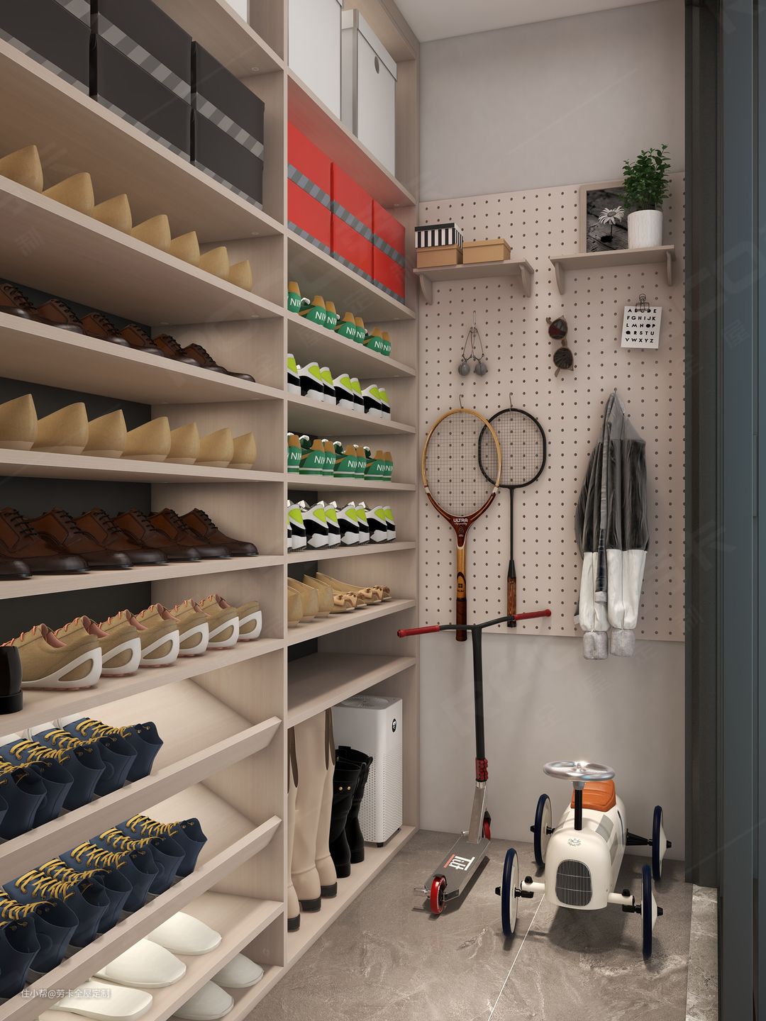 空间一边设计摆放日常出行的行李箱,另外一边则是设计成家庭日常运动的器材收纳区。洞洞板随意灵活设计,既能充分利用空间,又方便拿取。