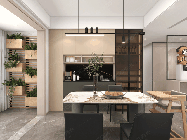 客厅无主灯设计搭配自带轻奢属性的大理石地面,轻微营造出轻薄的视觉效果,但是柜体的木纹纹理又能很好柔和空间,完美呈现出居家舒适度与温馨感。
