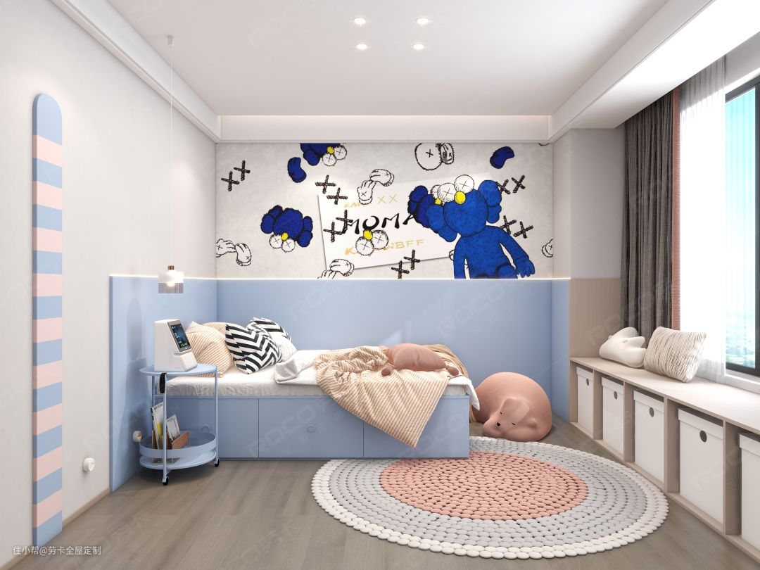 这里既是宝宝的休息的地方,也是进行娱乐的区域,更是物品收纳集中营。为了培养孩子收纳的好习惯,靠窗打造一排矮收纳格子,让收纳整理成为日常。