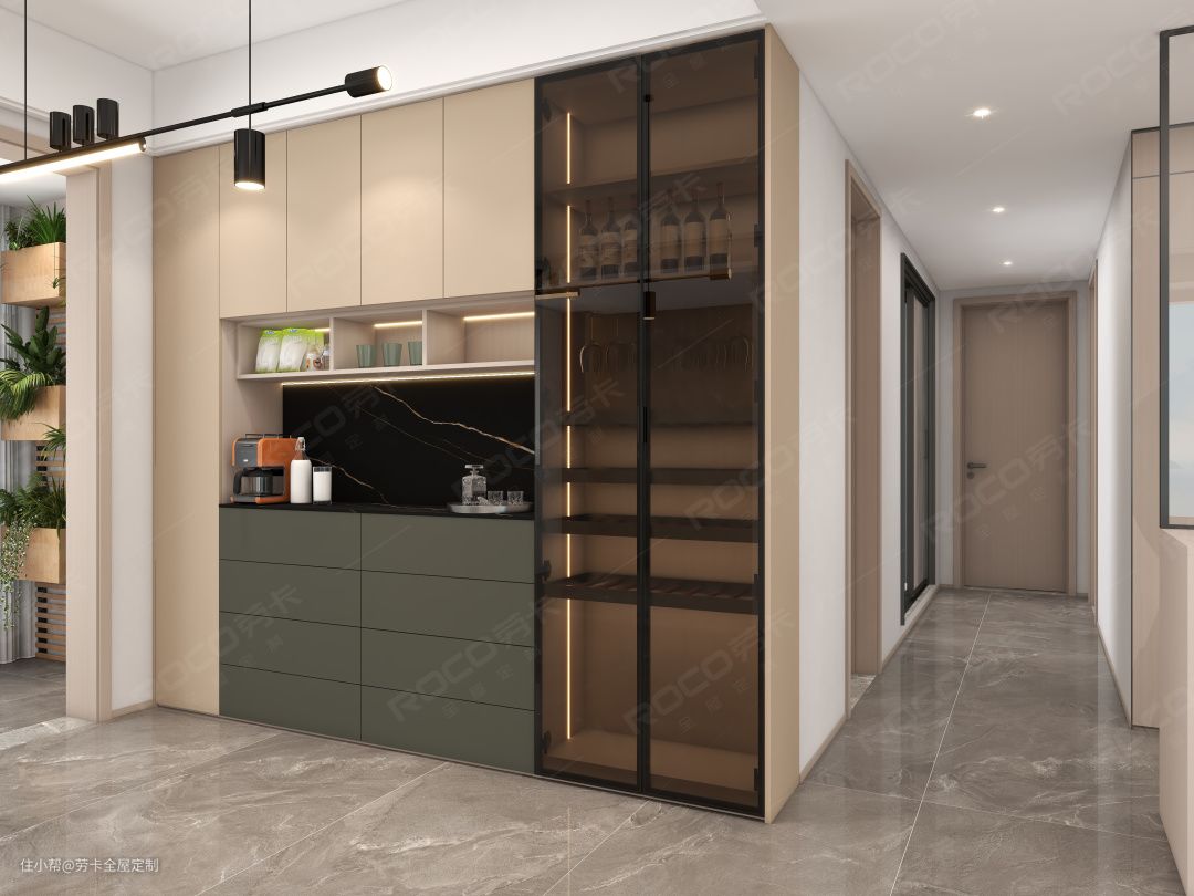 瓦灰+银釉深浅搭配,再加上金茶色玻璃柜门和灯带设计,既能对柜内物品一目了然,又能凸显高级质感。